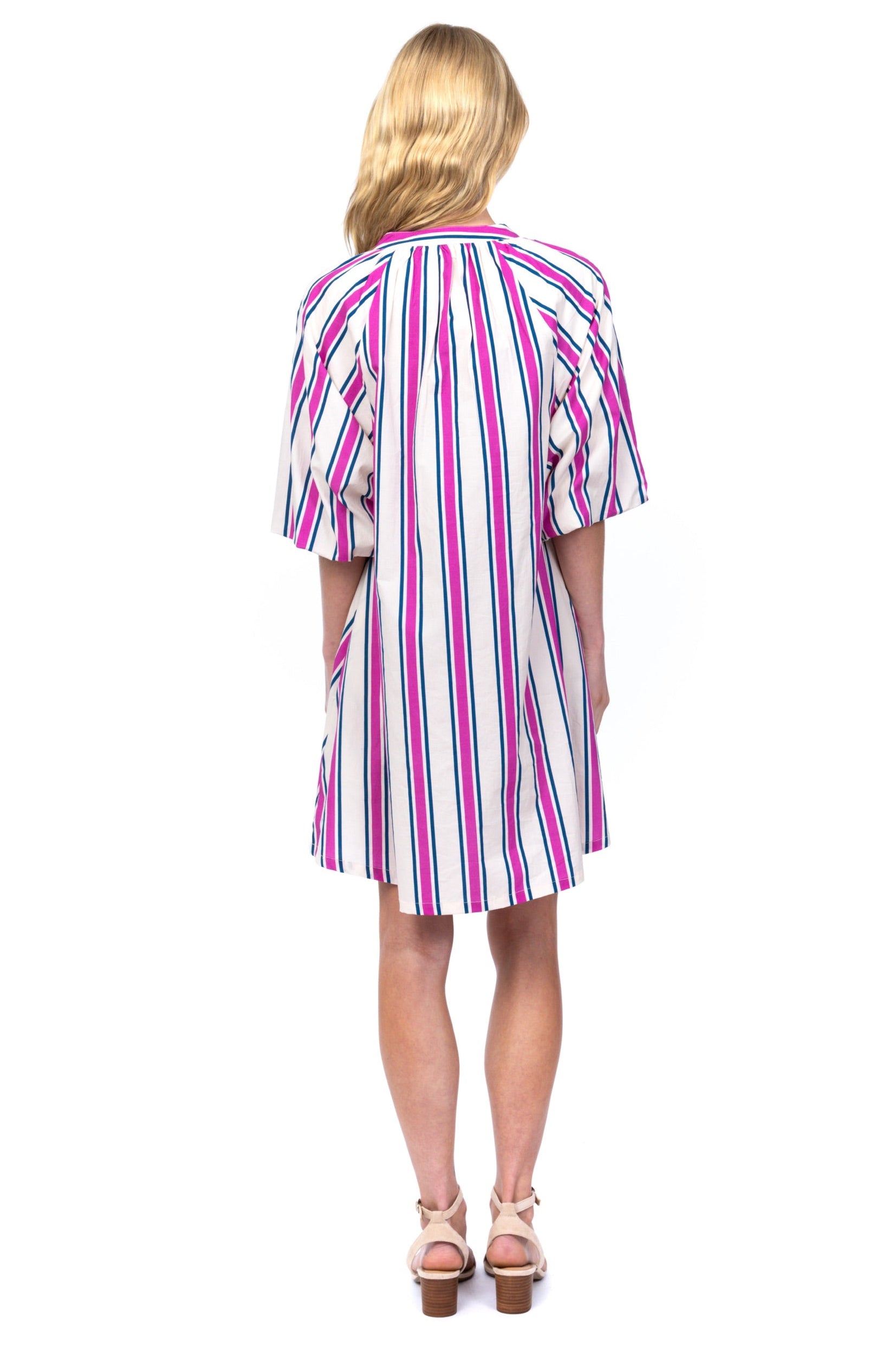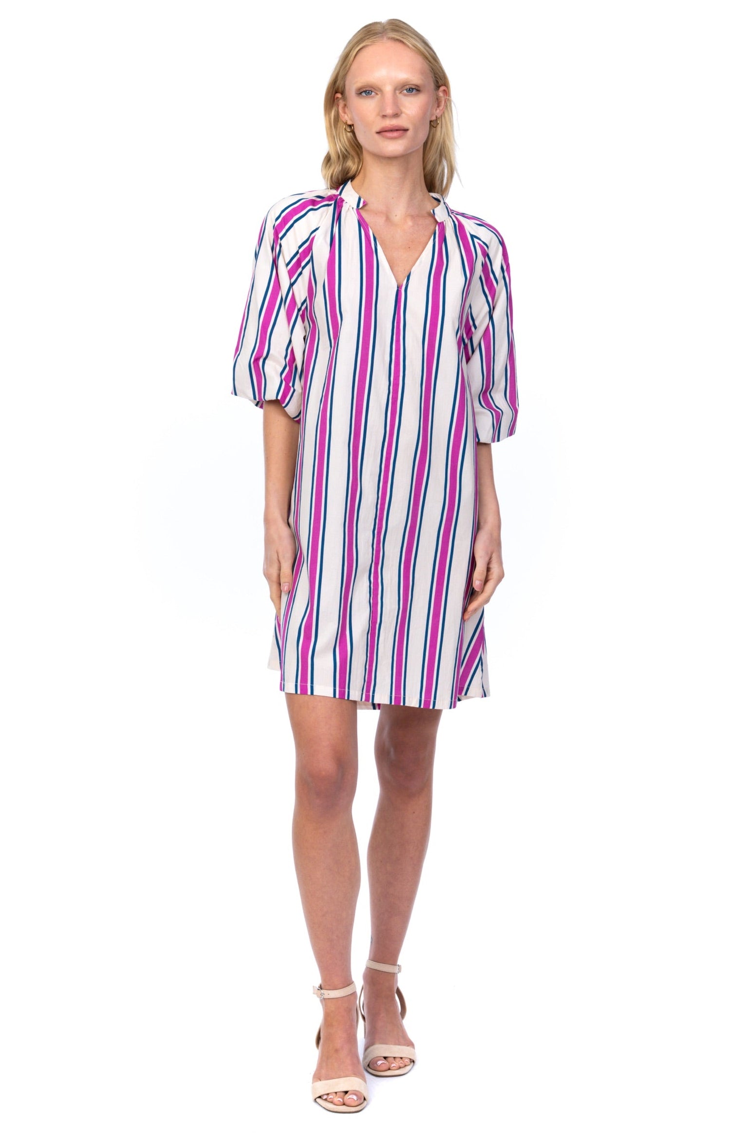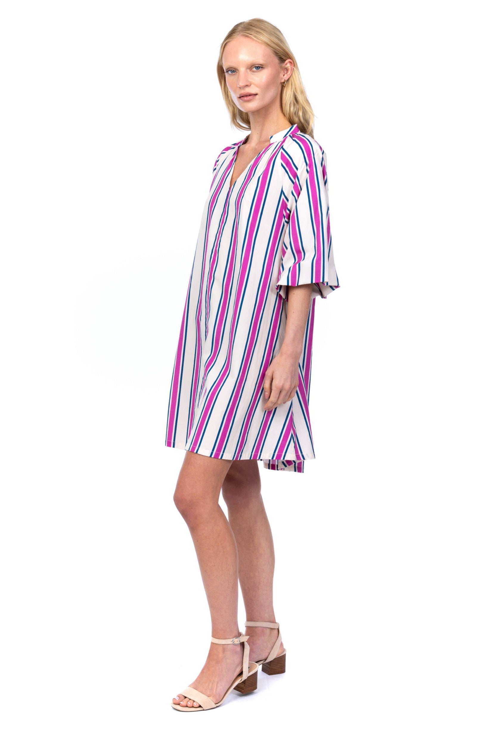 Effortlessly polished with a playful twist, this striped shift dress brings a fresh pop of color to your everyday wardrobe. Designed with a relaxed silhouette, it features a flattering split neckline, softly structured elbow-length sleeves, and a hemline that falls just above the knee for easy, versatile wear.