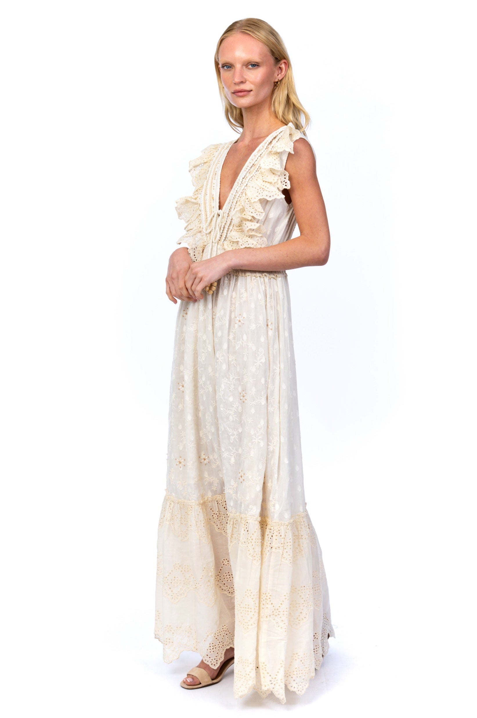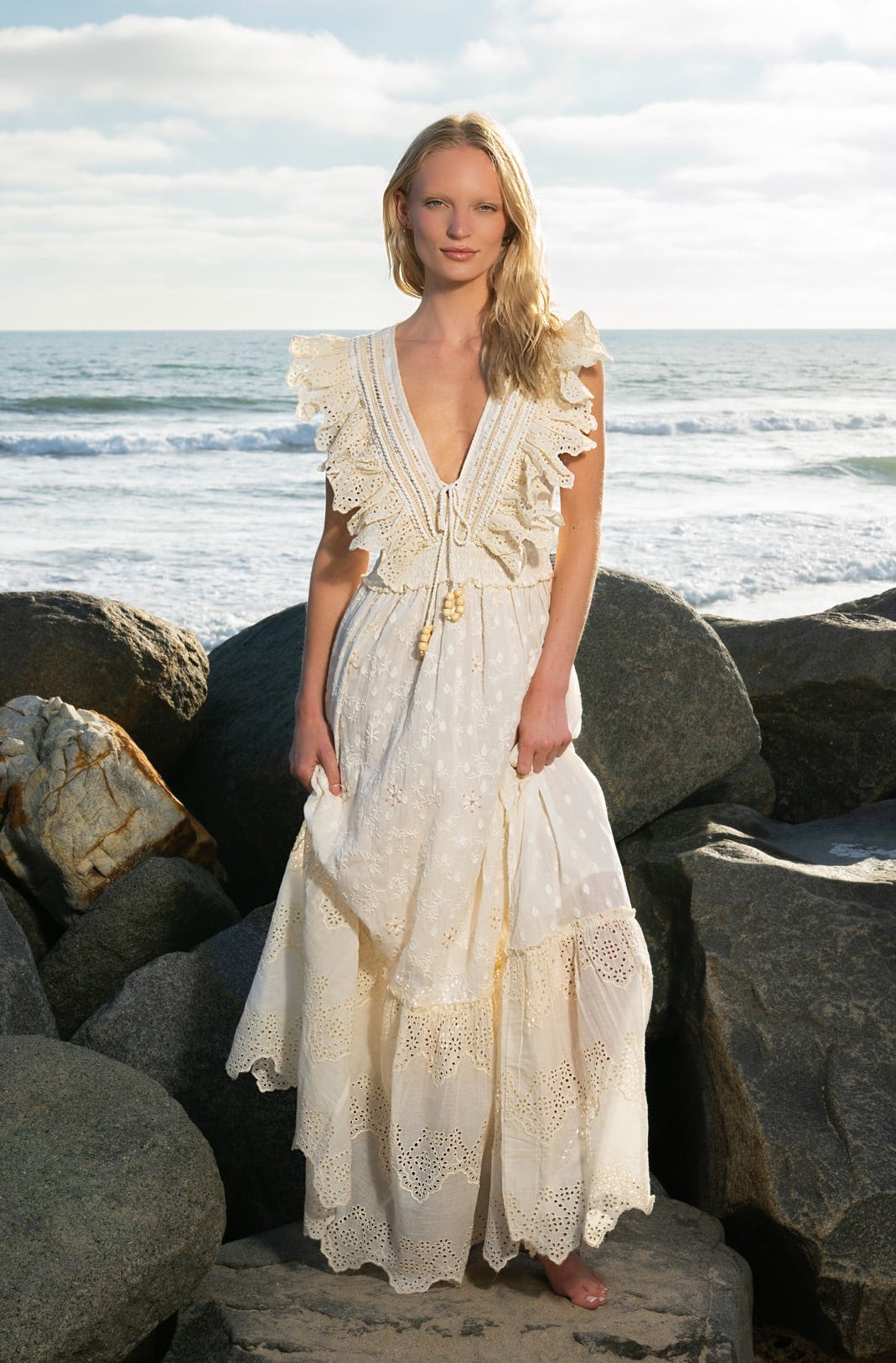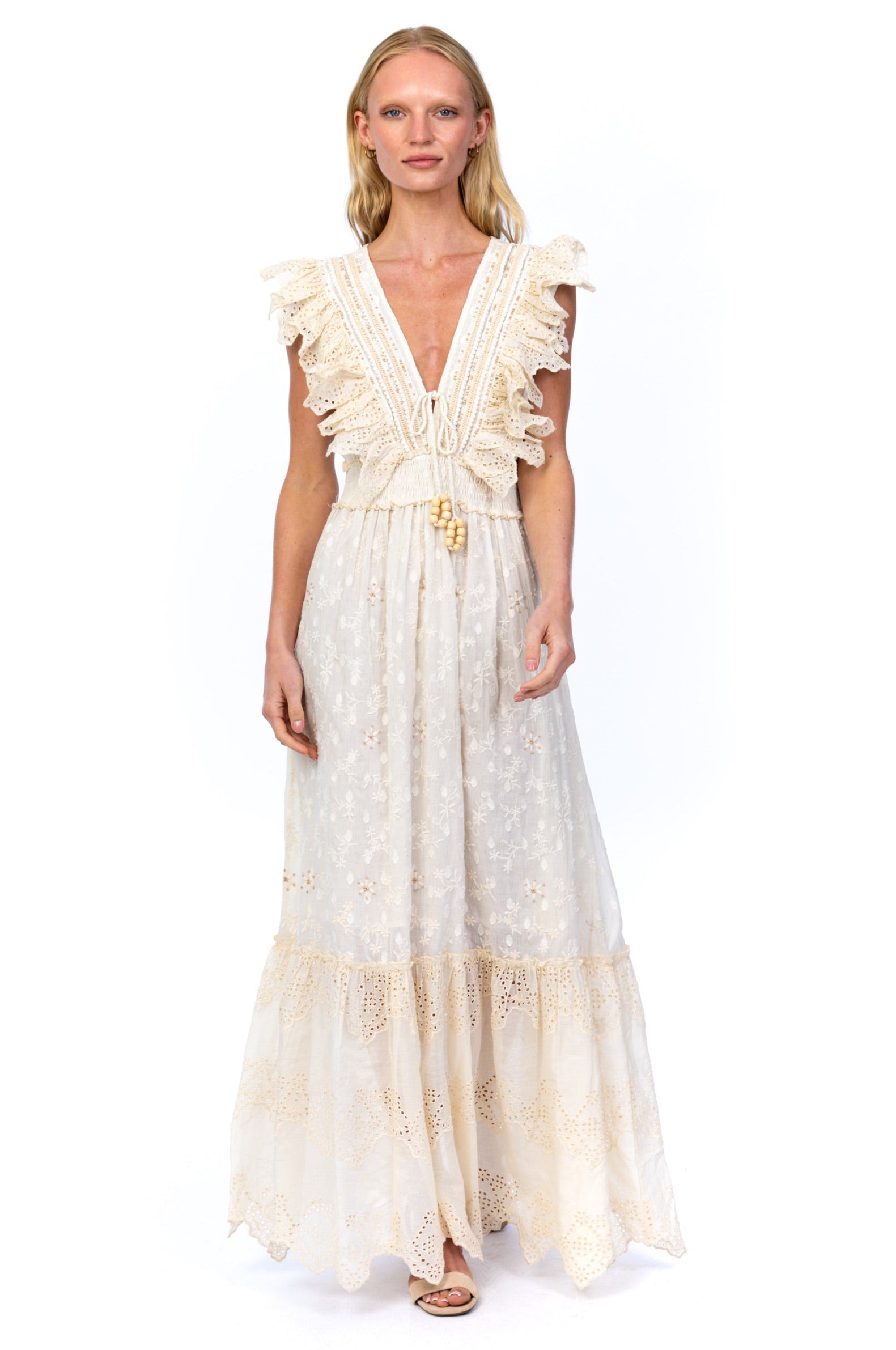 Ethereal and effortlessly romantic, this maxi dress captures a dreamy, bohemian spirit. Rendered in a soft ivory hue, it features delicate tonal embroidery and airy eyelet details throughout for a beautifully textured finish.