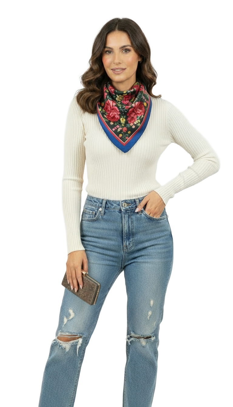 The Bandana Cobalt Scarf combines timeless style with everyday versatility. Crafted from lightweight material, this navy blue floral print scarf drapes effortlessly around your neck or shoulders without adding bulk. The classic bandana shape makes it ideal for layering, accessorizing, or styling your hair. Perfect for transitional seasons, this piece transitions seamlessly from casual to polished looks while maintaining breathable comfort throughout the day.