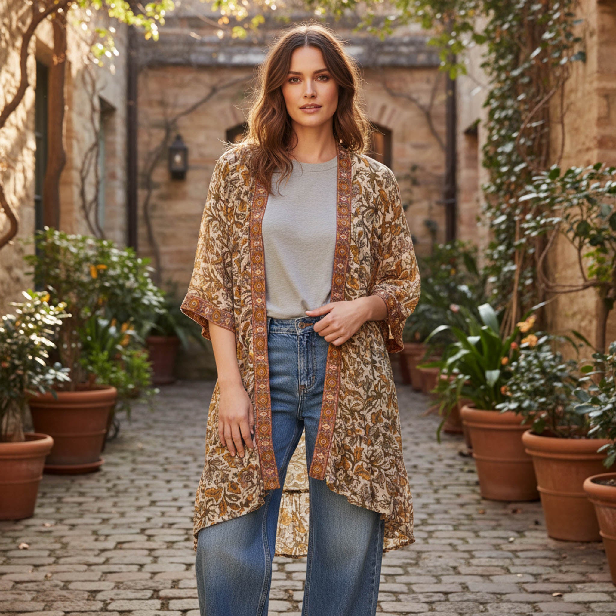 This elegant kimono features an earthy sage and beige palette adorned with intricate floral patterns, creating a timeless and sophisticated look. The open-front design is framed by a warm-toned, geometric border, adding depth and contrast to the piece. With its relaxed fit and three-quarter sleeves, this kimono offers both comfort and style, perfect for casual outings or elevated ensembles.
