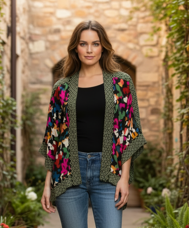 Add a bold touch to your winter wardrobe with the Raelyn Abstract Kimono. Use this statement piece to elevate any outfit, whether it's monochromatic or paired with jeans. The embroidered border adds a touch of texture and sophistication.