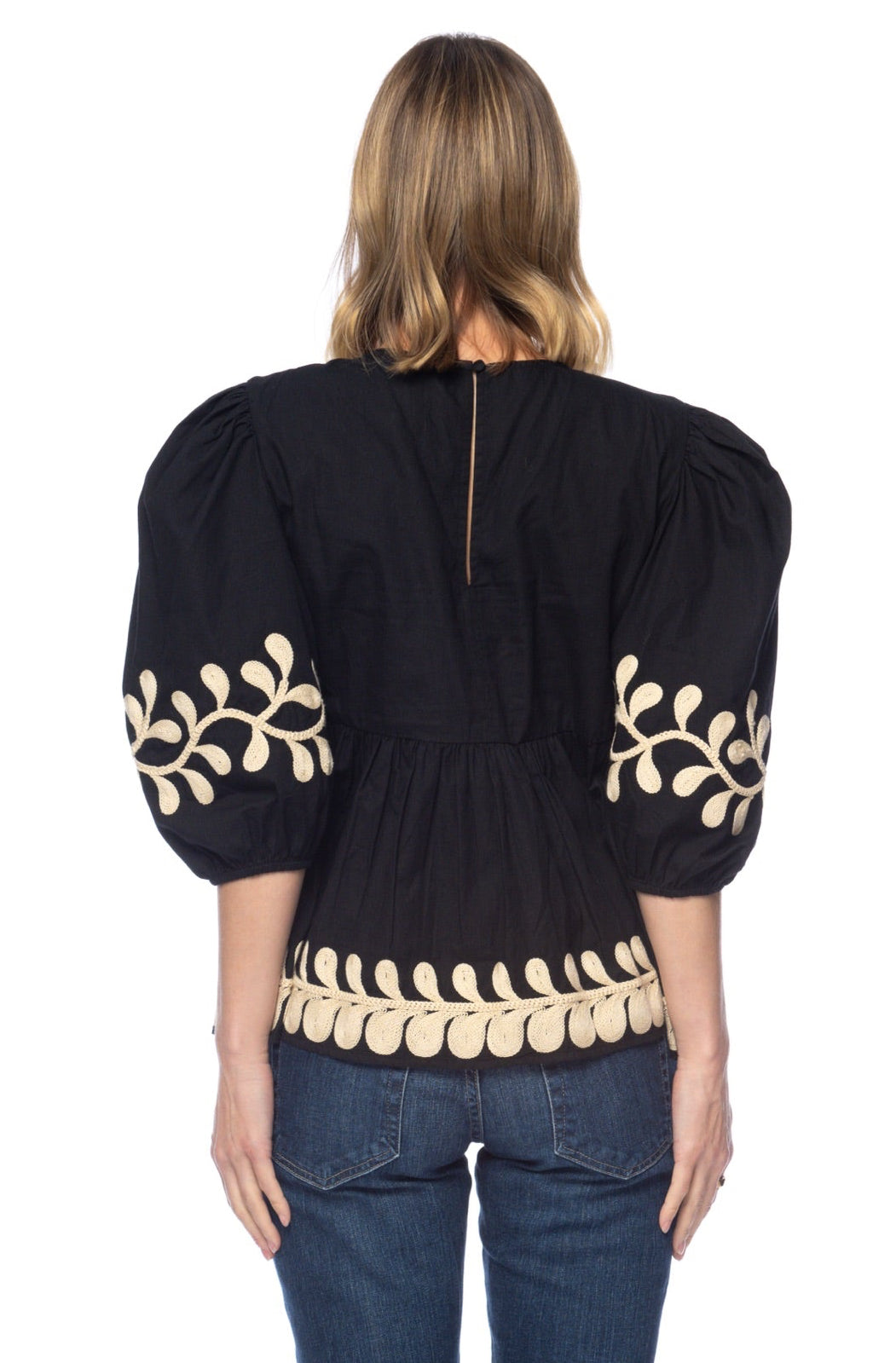 Effortlessly blending vintage charm with modern flair, this embroidered top makes a striking statement in any season. Crafted from soft cotton, this black blouse features beautifully placed cream embroidery inspired by hand-stitched botanicals. Voluminous puff sleeves and a gently gathered silhouette create a relaxed yet polished shape that flatters every figure.