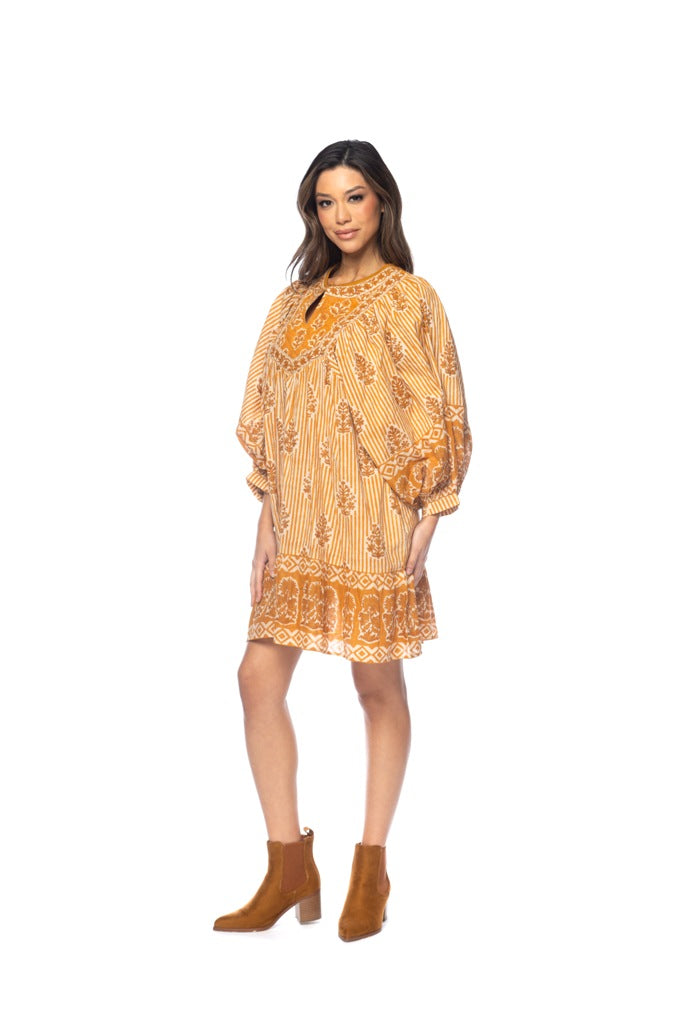 The Mustard Astella Flowy from Tolani is a versatile addition to your wardrobe. This mini dress features long puff sleeves and contrasting prints, creating a unique blend of modernity and tradition. With a comfortable crew neck and a length that hits just at the knee, it's perfect for pre-fall wear. Made from 100% cotton, it offers a comfortable fit. Inspired by global cultures, Tolani brings you a piece that's not just clothing, but a reflection of diverse fashion sensibilities. This dress is a testament to the brand's commitment to intricate detailing, eye-catching prints, and vibrant color blends. **The perfect western dress**