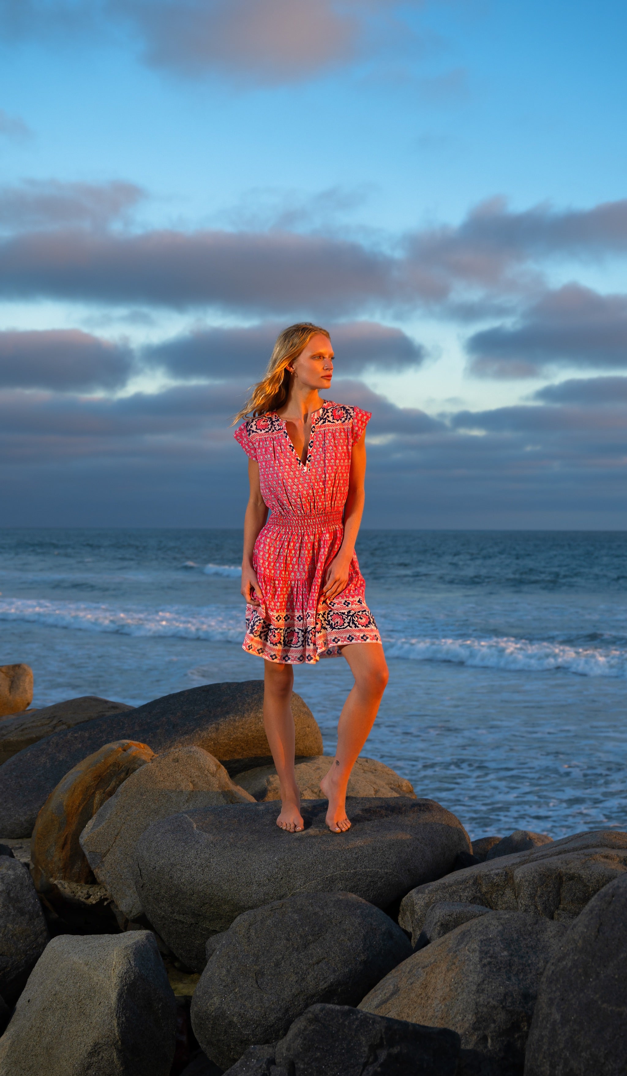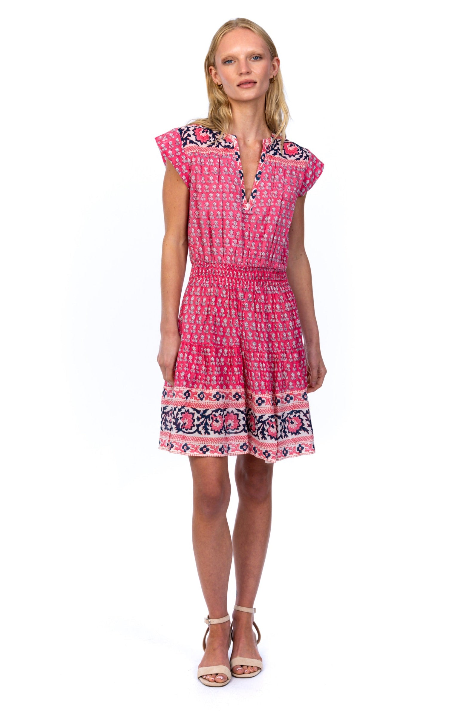 Vibrant and effortlessly playful, this printed mini dress brings a burst of color to your warm-weather wardrobe. Featuring an allover floral-inspired motif in rich pink hues, it’s accented with contrasting border details at the neckline and hem for a touch of artisanal charm. The split neckline and soft cap sleeves create a relaxed, feminine silhouette, while the smocked waist offers a comfortable, flattering fit.