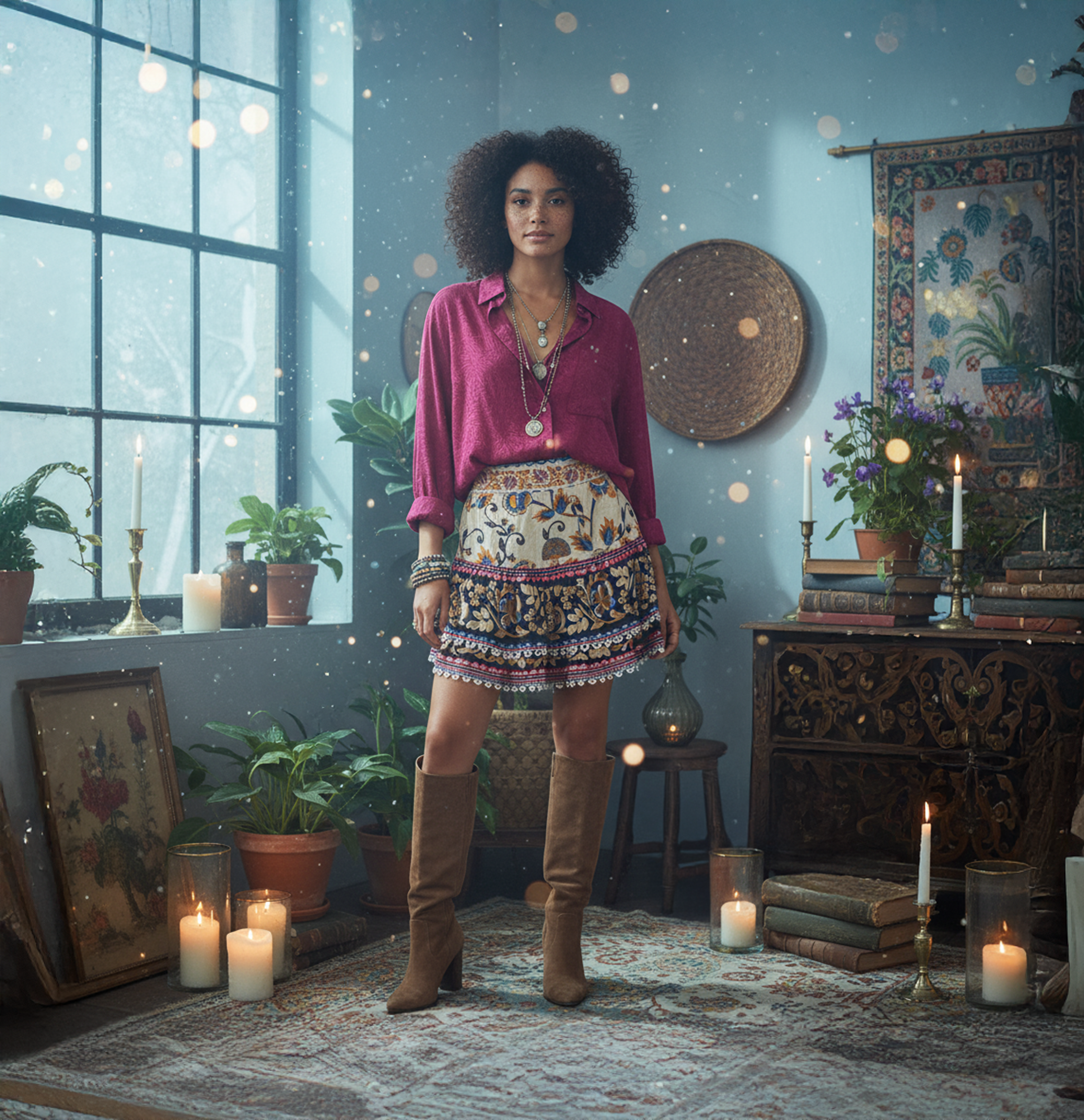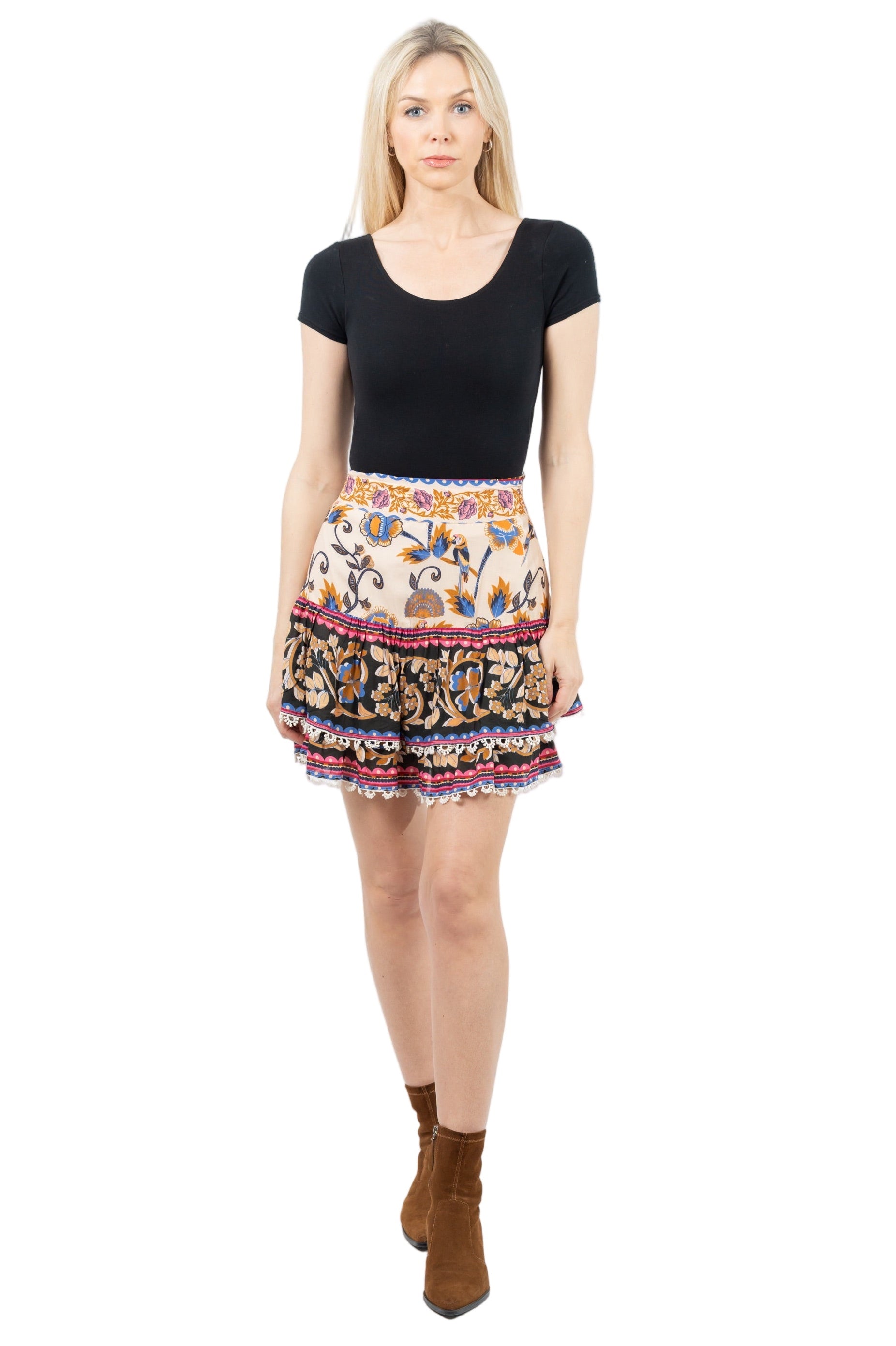 Infused with bohemian charm, the Demetria Vanilla Skirt brings effortless elegance to your everyday style. Crafted in a soft, flowy silhouette, this tiered mini skirt showcases intricate floral embroidery in rich tones of gold, blue, and coral set against a warm vanilla backdrop. Delicate lace trim and contrast borders add a handcrafted touch, while the elasticized waistband ensures all-day comfort and a flattering fit. Pair with a fitted tee or a breezy blouse for an elevated yet relaxed look that moves beautifully from day to night.