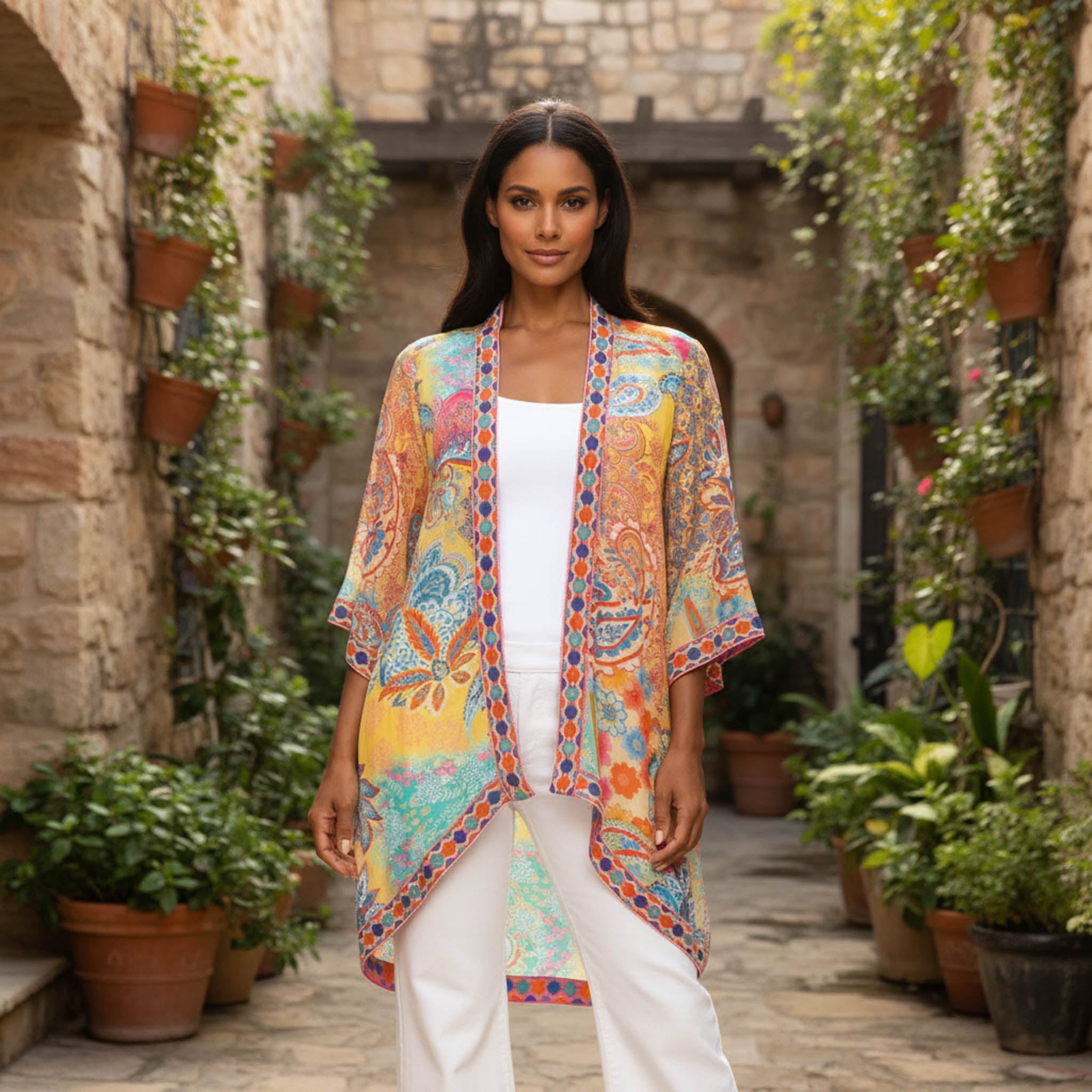 The Mantra kimono is perfect paired with a basic top and jeans for an easy and stylish look.