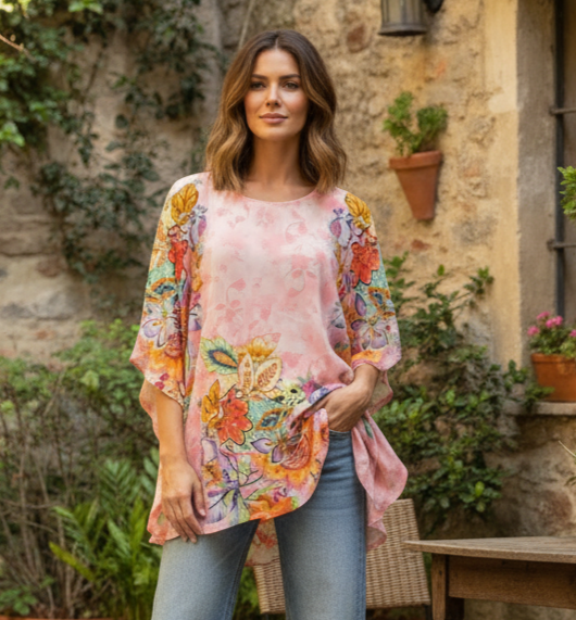Add a touch of elegance to your wardrobe with this dreamy floral tunic. Featuring soft pink hues with vibrant floral accents, this flowy piece offers a relaxed yet sophisticated look. Perfect for layering over leggings or skinny jeans, it’s ideal for both casual days and special occasions.