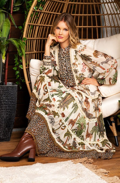A stunning mix of wild and whimsical, this full-length dress features hand-drawn safari animals, bold leopard print accents, and a flattering tiered silhouette perfect for any destination.