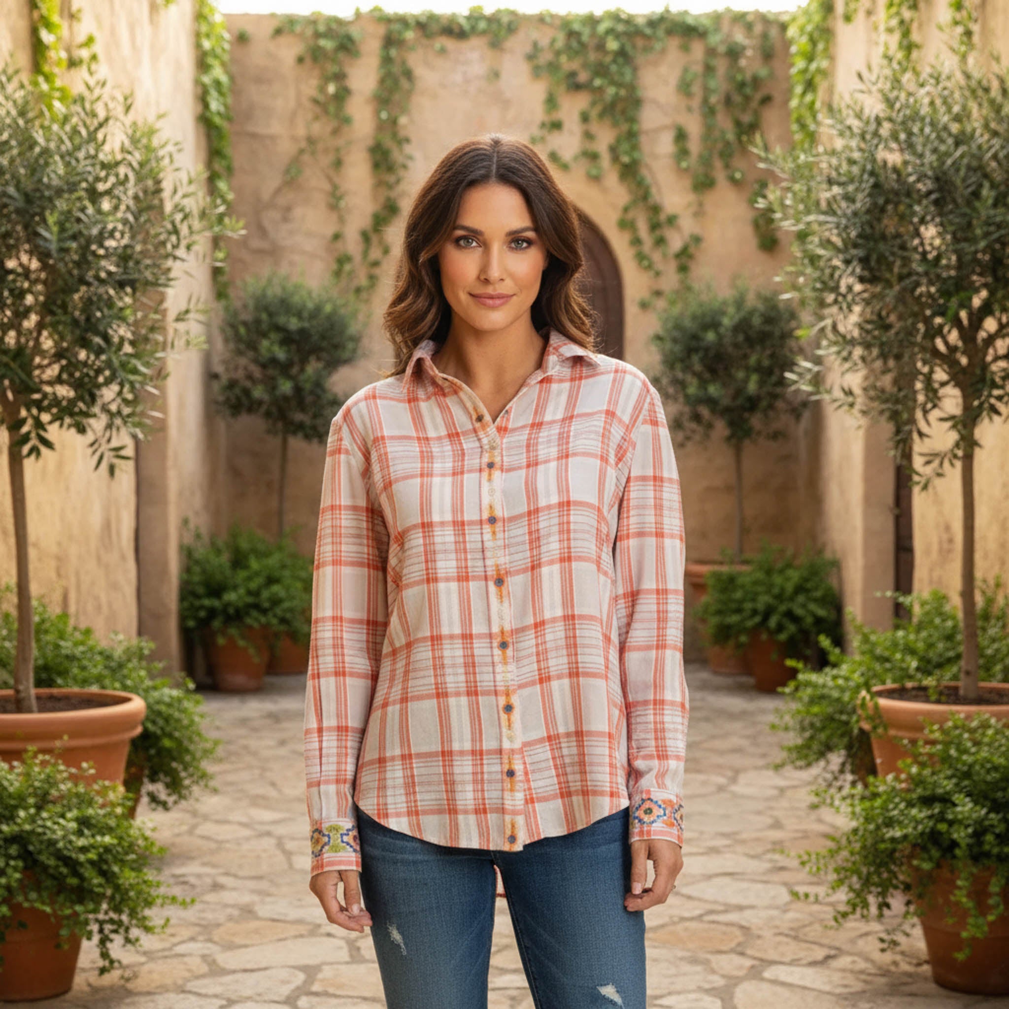 Upgrade your wardrobe with the Harlow Tangerine Top. Featuring an intricately embroidered back and cuffs, this classic plaid top adds a special twist to your everyday look. With long sleeves and a collared front button down, enjoy both style and comfort in this must-have piece.