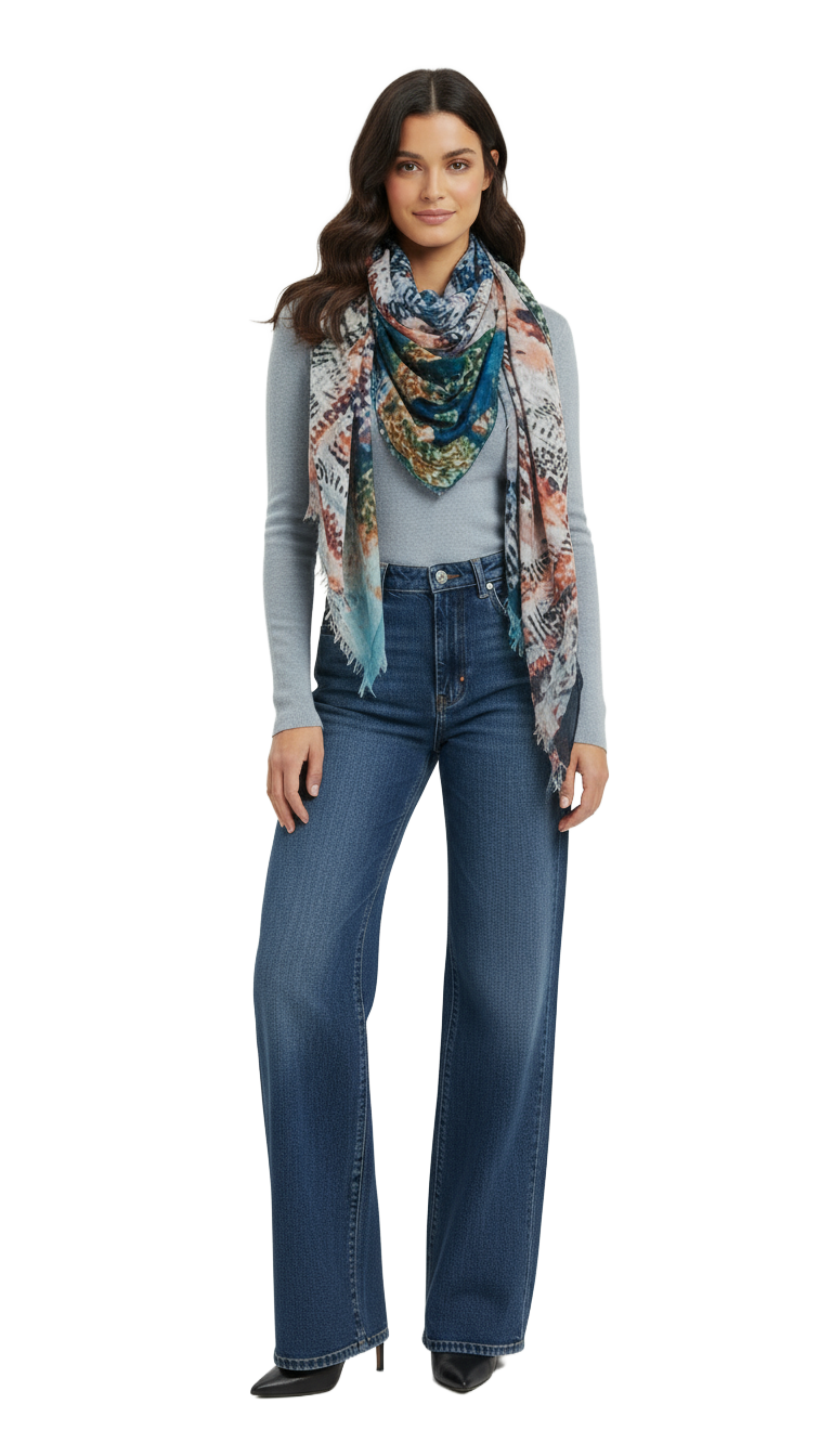 Discover refined elegance with this expansive square scarf, engineered from delicate lightweight fabric that ensures effortless draping and all-season comfort. The nuanced blue and green color story evokes tranquility and sophistication, offering a distinctive alternative to conventional palettes. The generous proportions accommodate diverse styling possibilities—secure it at your neck for polished restraint, wrap it around your head for protective elegance, or arrange it across your shoulders for dimensional interest. The breathable weave makes it an indispensable accessory for those who value both aesthetic refinement and practical versatility.