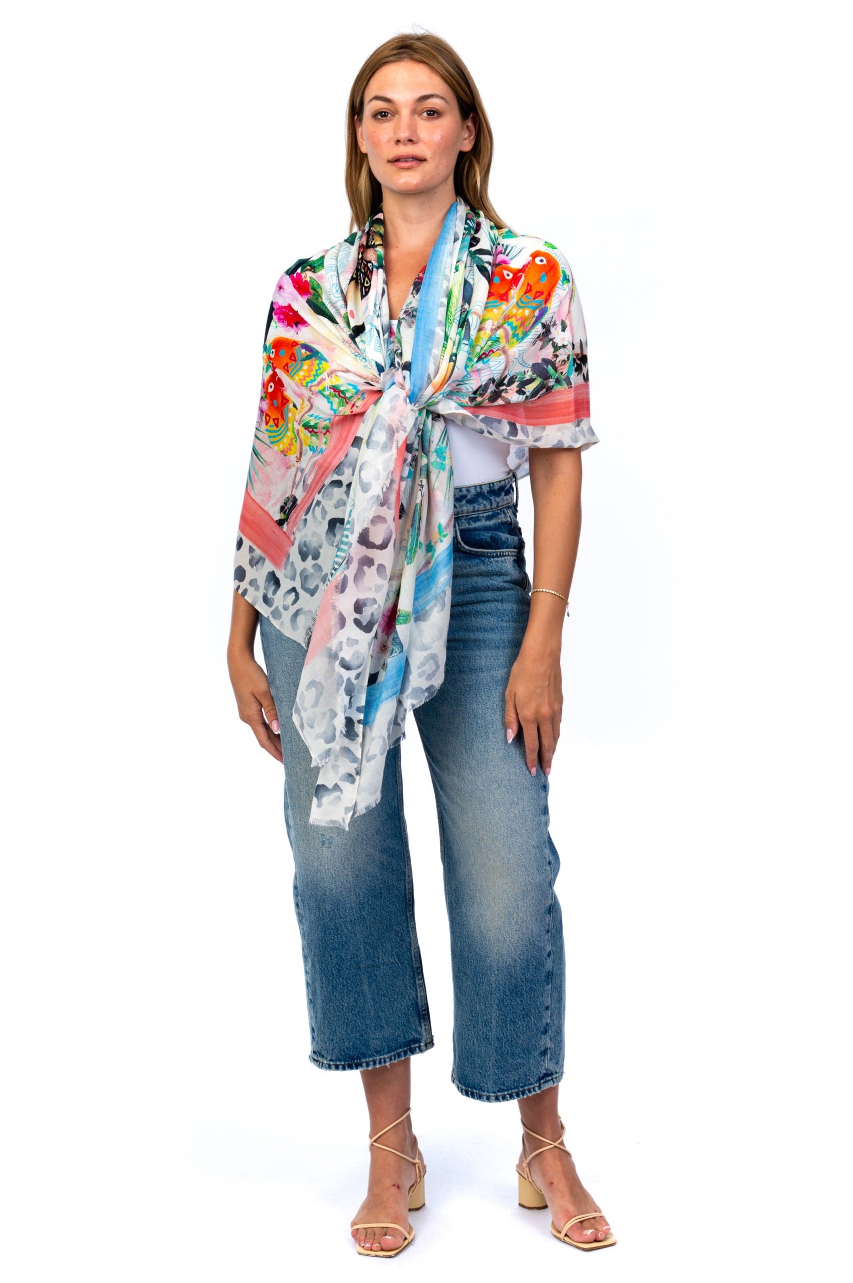 Add instant color and personality to any outfit with this eye-catching lightweight scarf. Designed with a rich mix of floral motifs, playful animal prints, and bold pops of turquoise, coral, and sunny yellow, this piece feels effortlessly artistic yet easy to wear. The soft, airy fabric drapes beautifully over the shoulders and ties with ease, making it perfect for layering year-round.