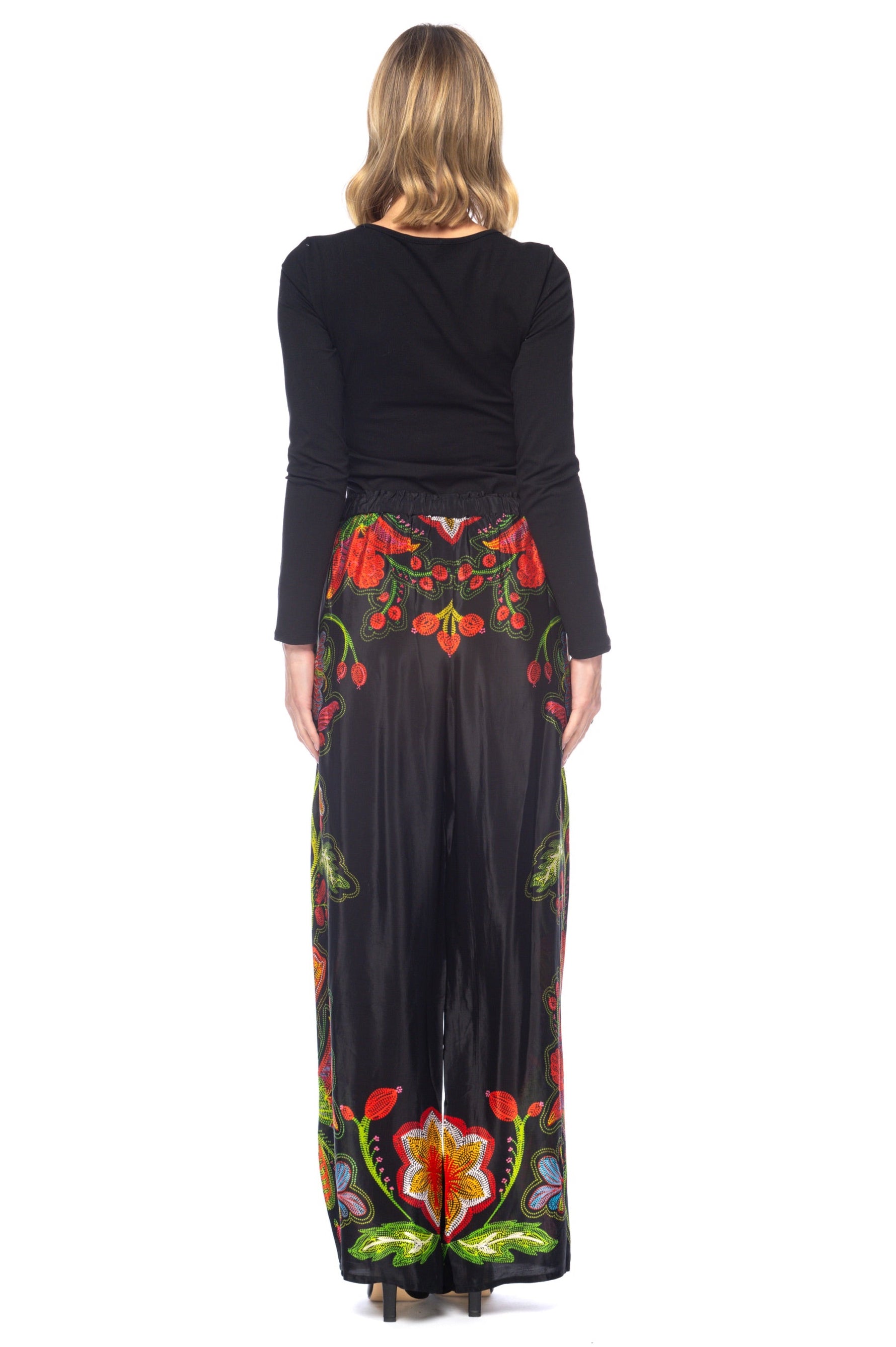 Make a bold statement with the Fabiola Sable Pants. Crafted from a soft, flowing fabric, these wide-leg pants feature a vibrant, hand-drawn floral print that pops against a deep black background. The elastic waistband with adjustable drawstring ensures a comfortable, flattering fit, while side pockets add everyday functionality. Effortlessly pair them with a simple black top for a chic, relaxed look that transitions seamlessly from day to night.