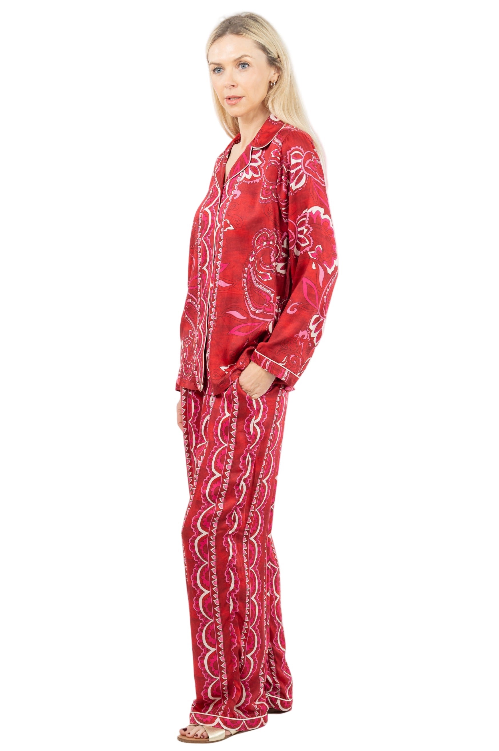 Infused with bohemian charm and modern ease, this cherry-red pajama set brings a sense of vibrancy to your downtime. Crafted from a silky, lightweight fabric that drapes beautifully, it’s decorated with an intricate paisley-inspired motif in tones of blush pink and ivory — a nod to timeless elegance with a contemporary twist. The relaxed shirt features a classic notched collar and contrast piping, while the coordinating wide-leg trousers sit comfortably at the waist with a softly elasticated band. Perfect for luxurious lounging or styled as an elevated day set, it captures effortless sophistication with a bold, expressive spirit.