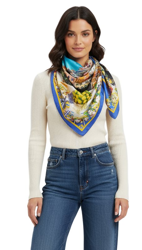 Inspired by the sun-drenched landscapes of Italy's Amalfi Coast, this silk bandana scarf captures the essence of Mediterranean elegance. Each piece features a distinctive, artisanal print that celebrates the region's iconic color palette—from coastal blues and terracotta accents to soft cream and sage tones. Crafted from luxurious silk, the lightweight construction ensures graceful draping whether worn as a neck scarf, head covering, or bag accent. The delicate, one-of-a-kind design elevates any ensemble with understated sophistication, making this an investment piece that transcends seasonal trends and complements both casual and refined aesthetics.