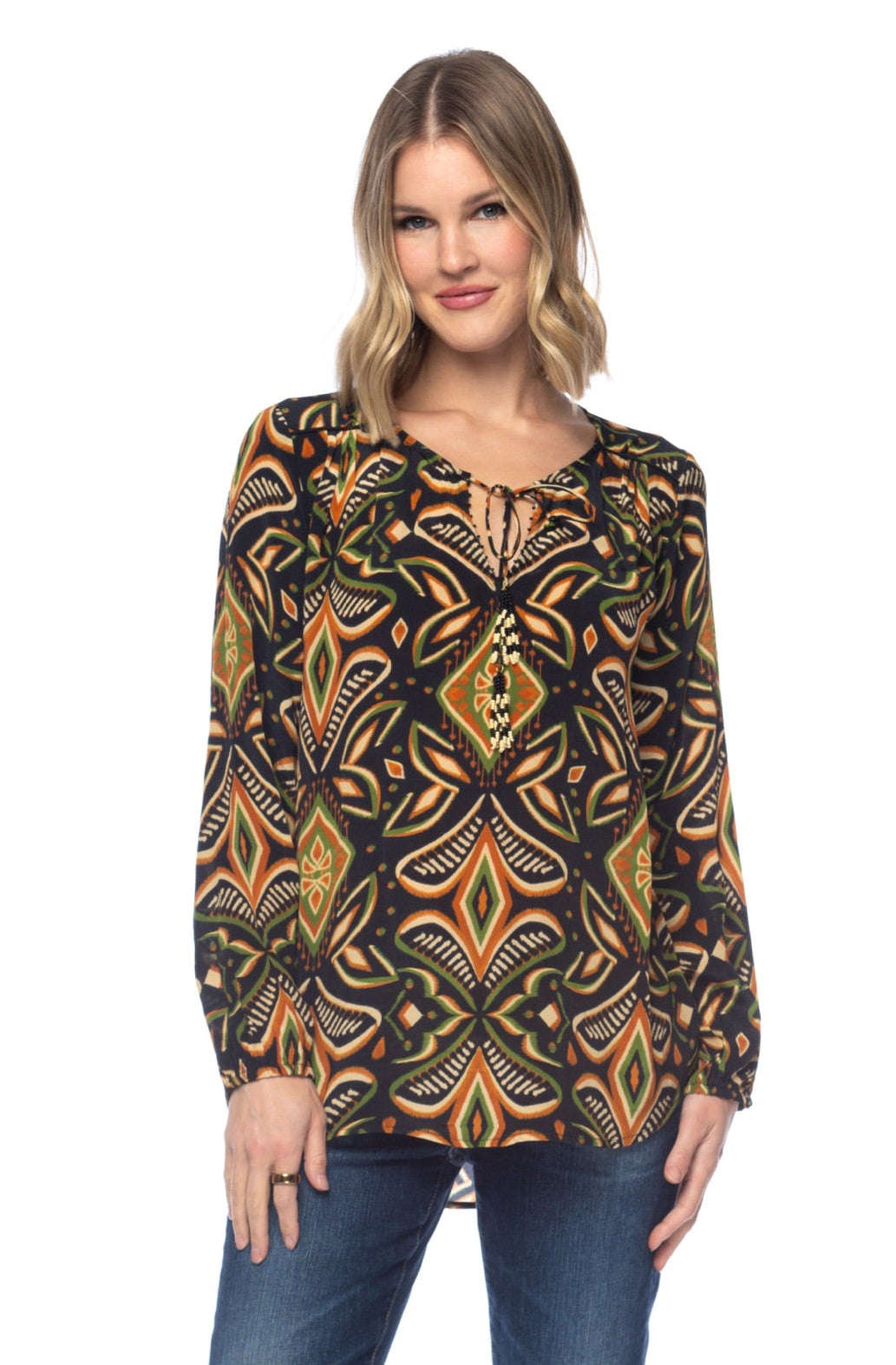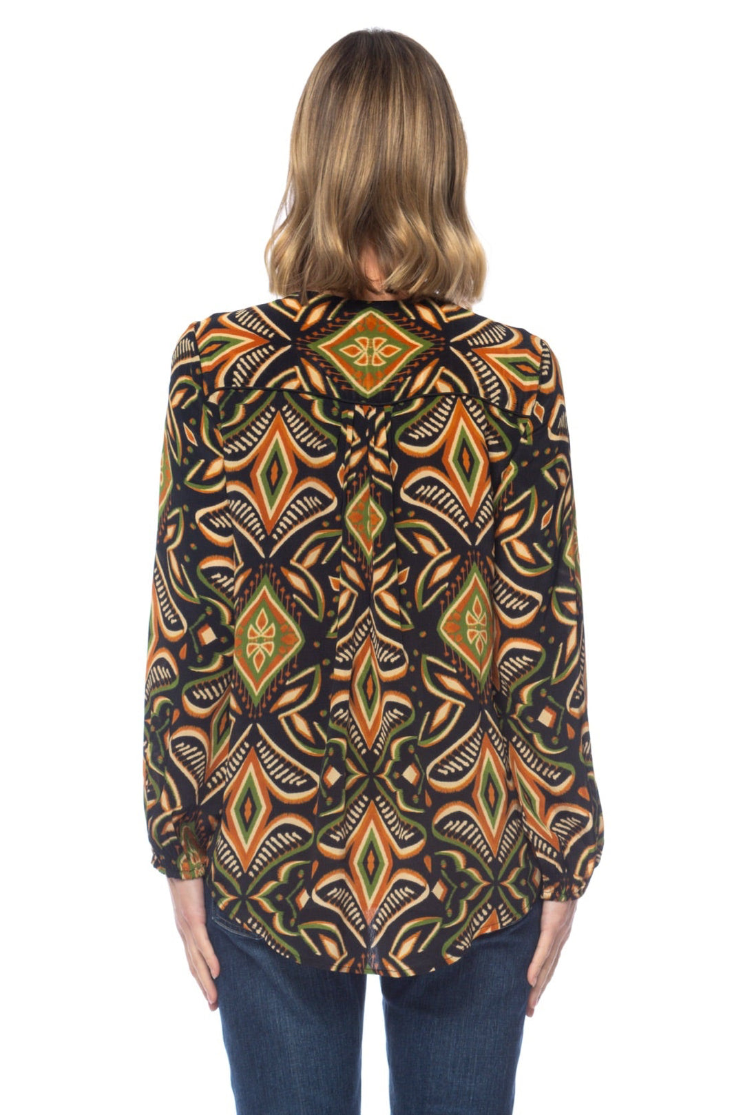 Bursting with vibrant energy and boho flair, the Janessa Cactus Blouse features a striking geometric motif in earthy tones of amber, green, and black. Crafted from a silky, lightweight fabric, this flowy top offers an effortlessly flattering silhouette. The relaxed fit and soft gathers at the neckline lend a feminine touch, while the delicate tie-front detail adds a hint of laid-back charm.