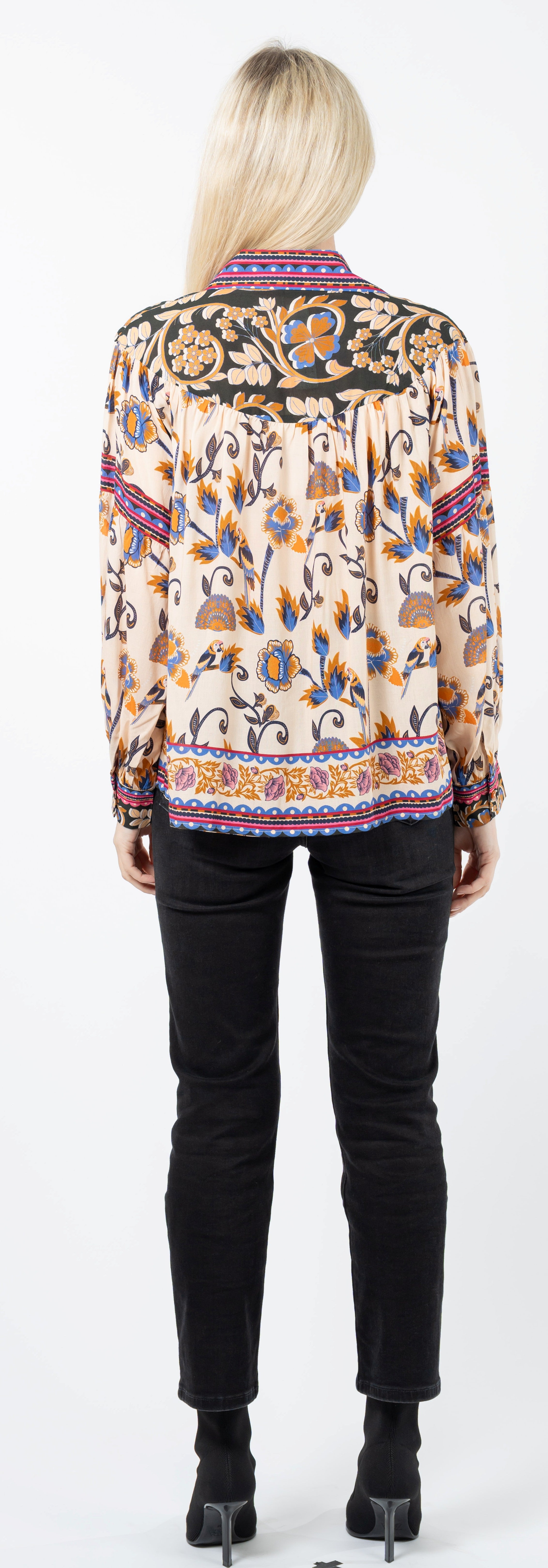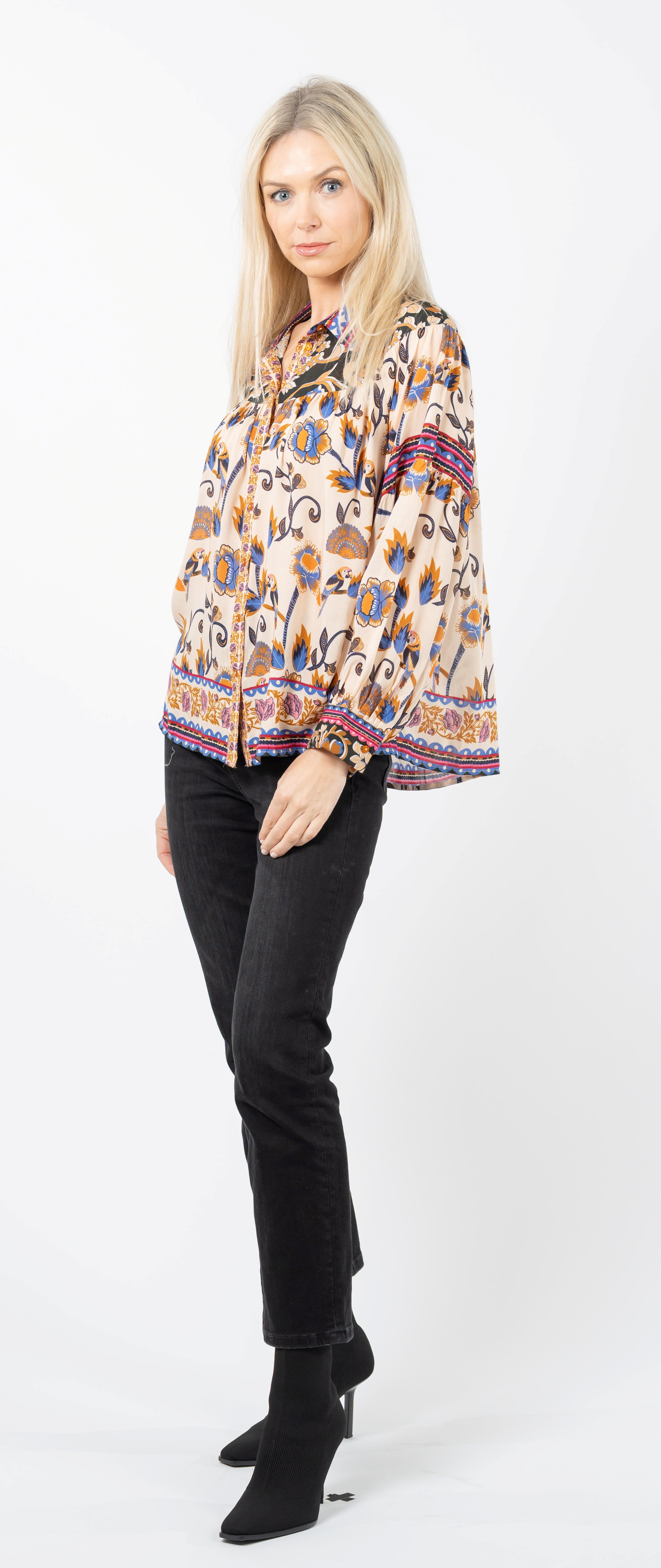 Experience the rich blend of culture and contemporary fashion with Tolani's Vanilla Rahema Relaxed Fit blouse. This long sleeve top features a stylish button front and collar. Inspired by the vibrant cultures of North India, this piece captures a unique combination of modernity and tradition. With its eye-catching design and luxe quality, Tolani offers a fashion experience that's loved by Hollywood's 'it' girls. Elevate your wardrobe with this timeless piece.