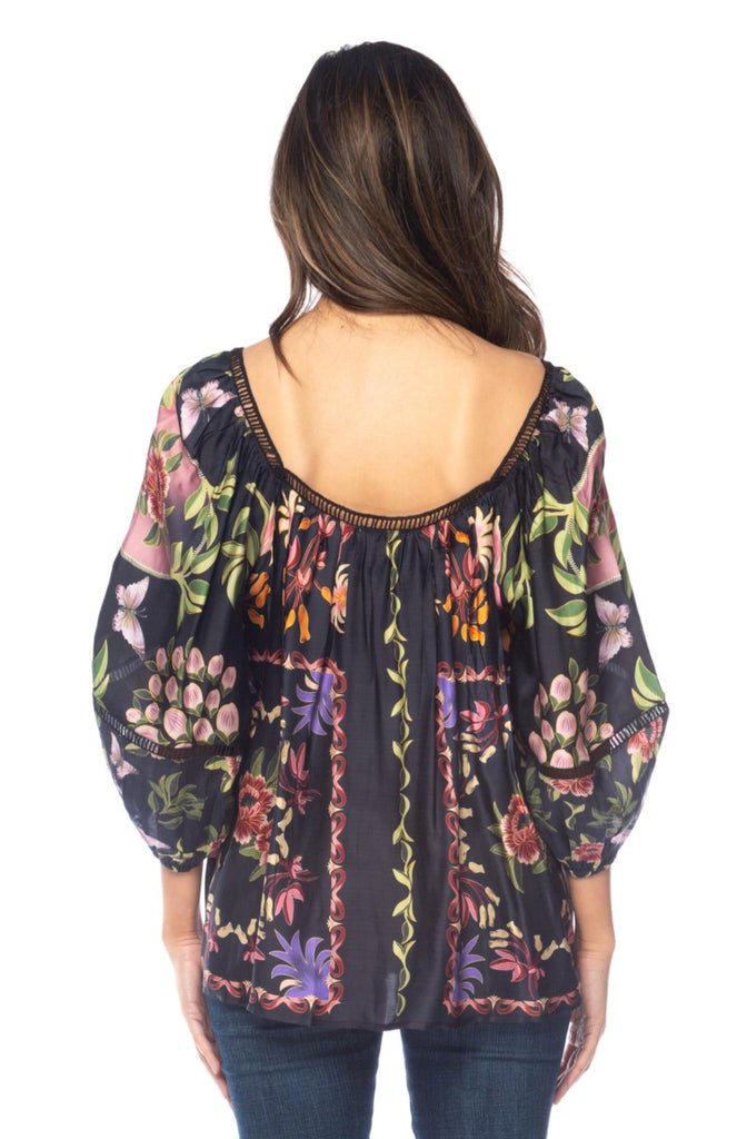 Effortlessly elegant, the Abe Paradise Top is cut from an ultra soft, fluid fabric that drapes softly over the body. A striking floral print in rich tones gives it a serene, resort‑chic appeal. The silhouette is relaxed yet tailored, featuring a gentle V‑neckline and subtle gathers that add movement without bulk.