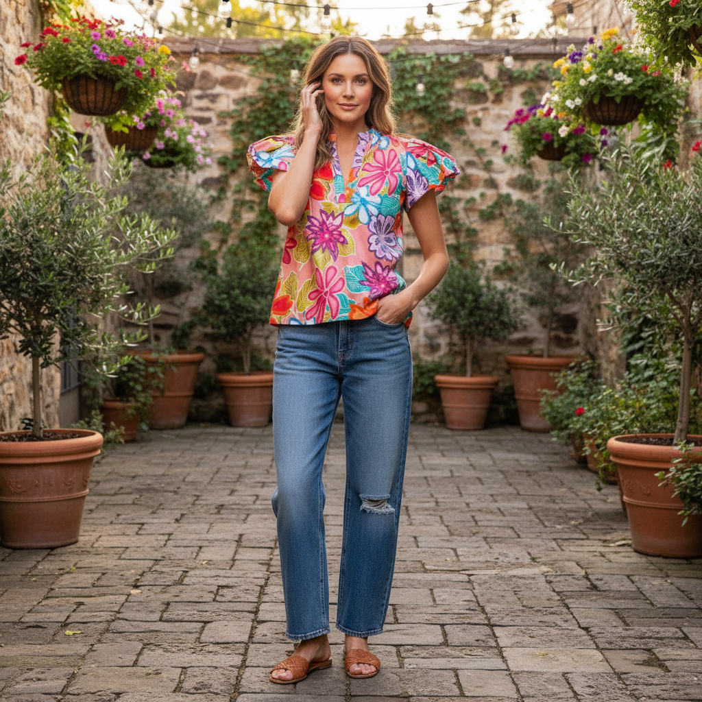The Aida Blush Top features a striking floral print in vibrant hues, elevated by dramatic puff sleeves that add contemporary flair. The V-drop neckline creates a flattering silhouette, while the straight hemline ensures a polished, versatile fit. Perfect for layering or wearing solo, this short sleeve blouse transitions effortlessly from day to evening occasions.