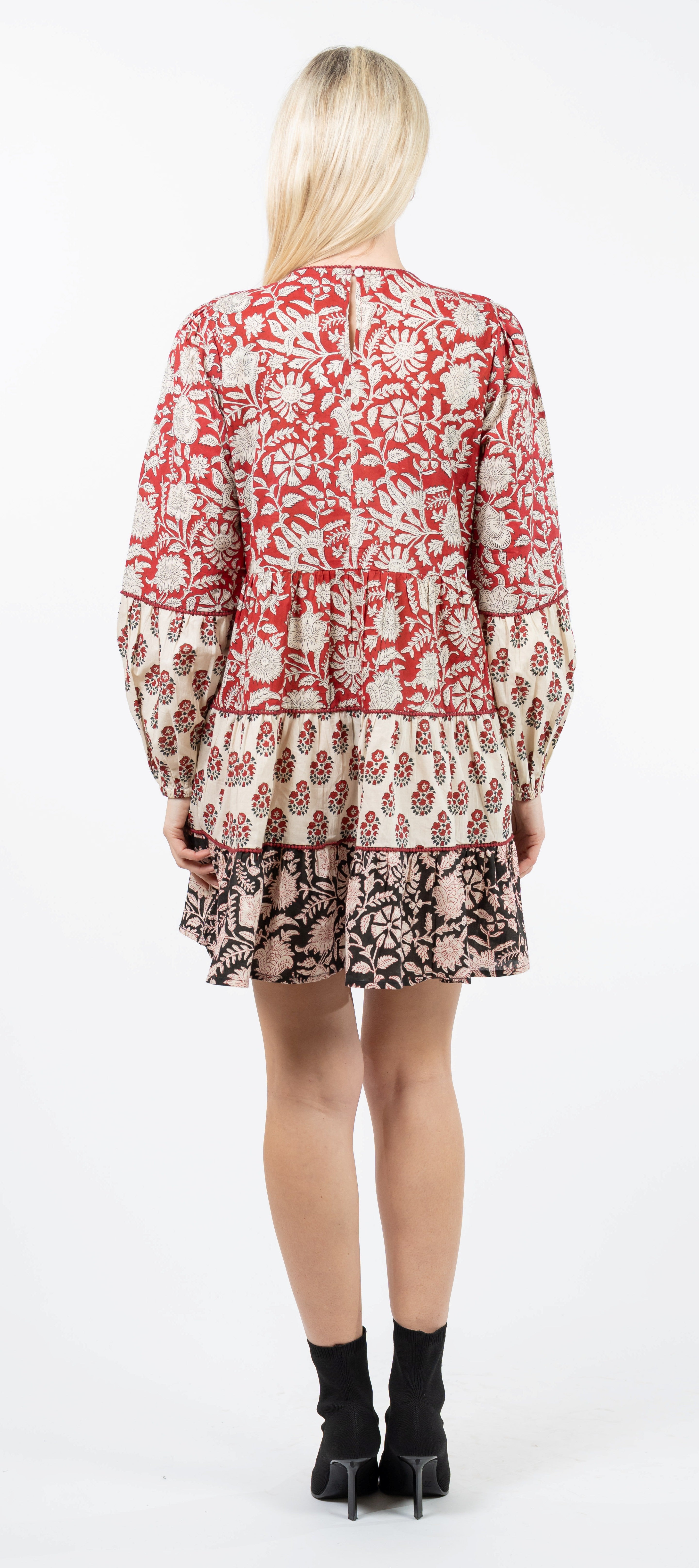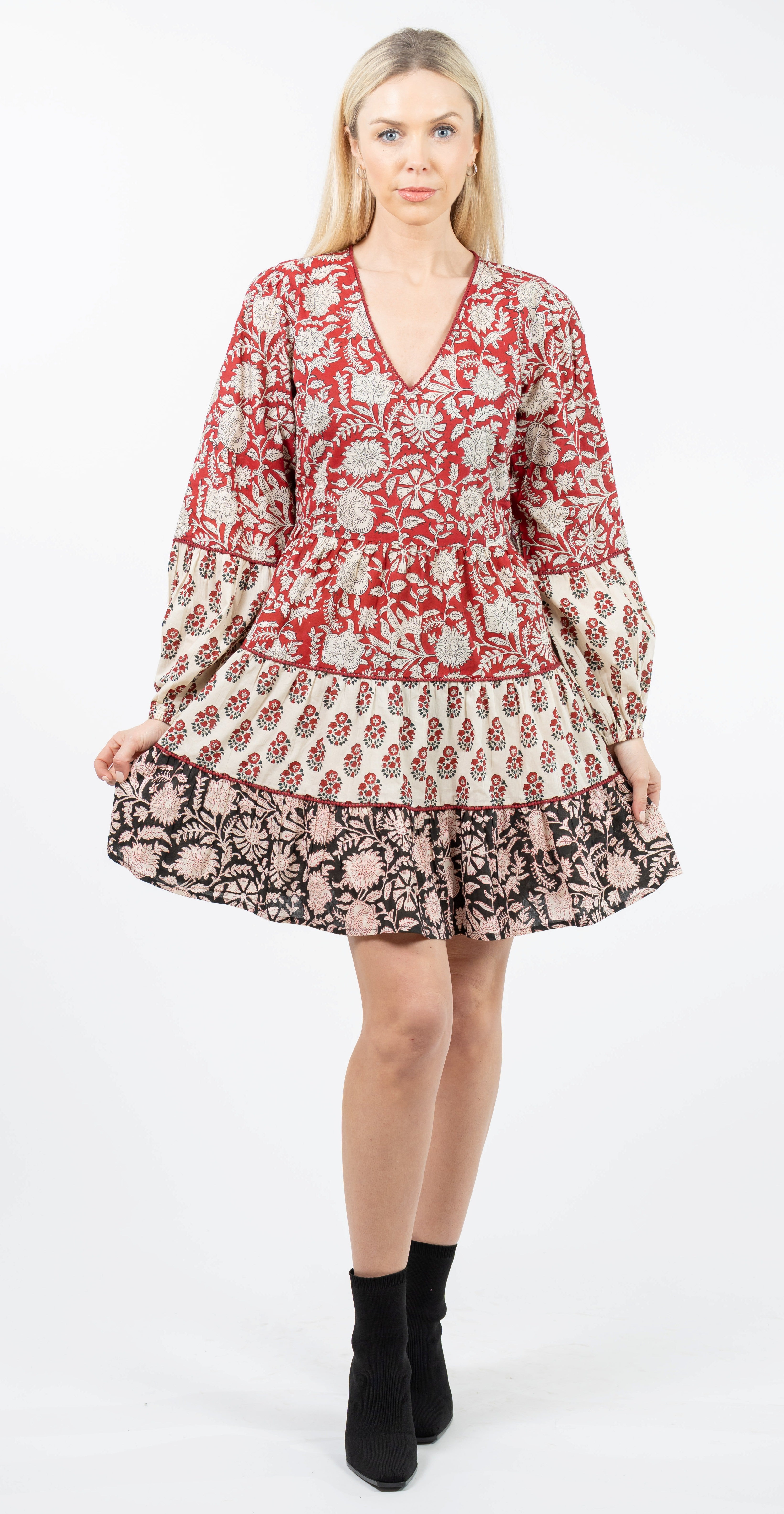 The Drax Onyx Dress is a playful short dress showcasing a patchwork-inspired floral design in warm tones of red, cream, and black. Featuring a V-neckline, long blouson sleeves, and a tiered skirt with contrasting borders, this dress offers both charm and movement. Its relaxed silhouette makes it a versatile choice for casual outings or elevated daywear.