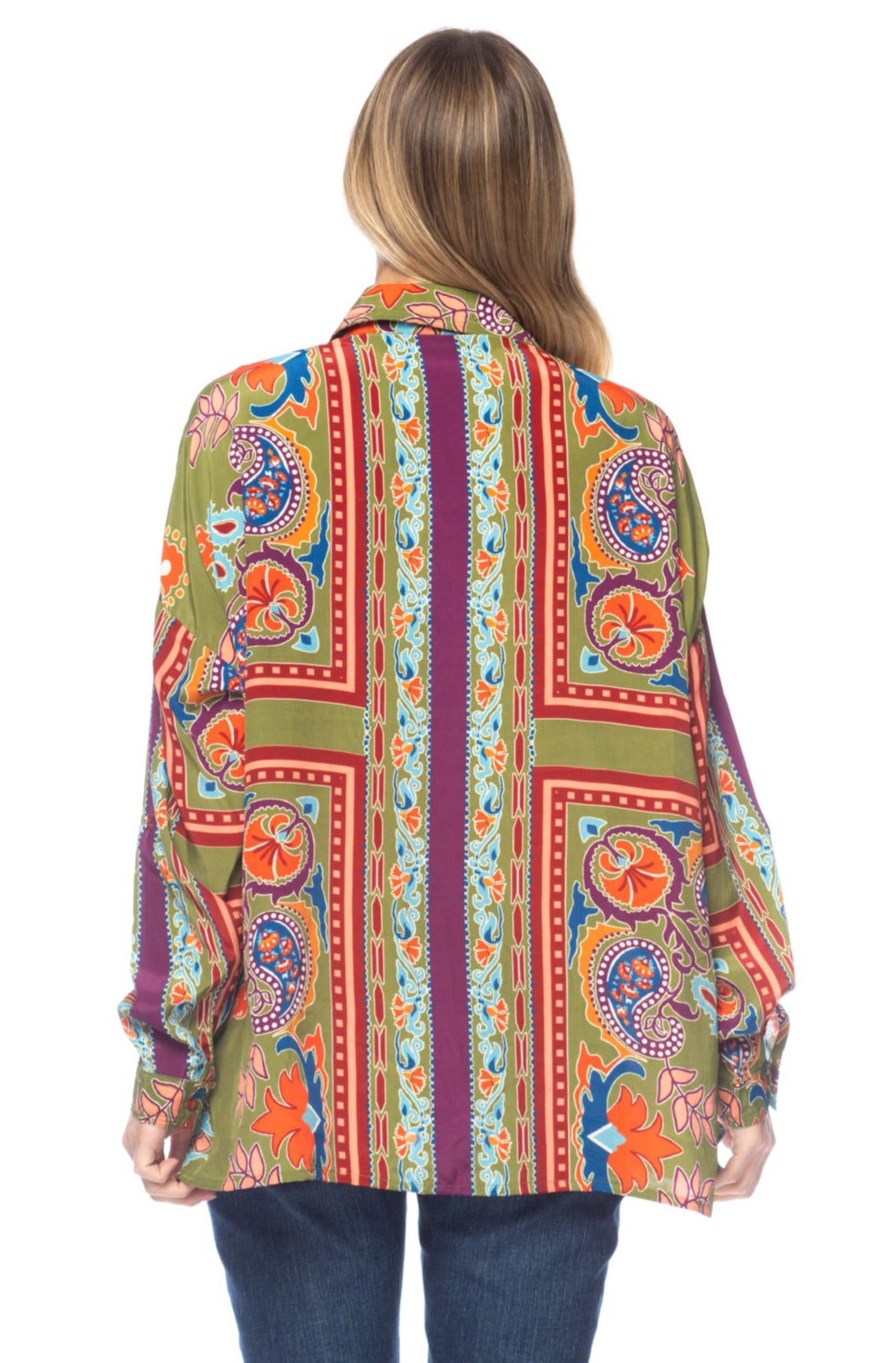 Our Kennedy Ethereal blouse is a statement piece designed with a modern bohemian spirit. Crafted from silky, fluid fabric, it features a vivid patchwork of paisley and floral motifs in rich jewel tones, framed by geometric borders. The relaxed silhouette with button-down front and fluid sleeves makes it an easy choice for day-to-night styling.
