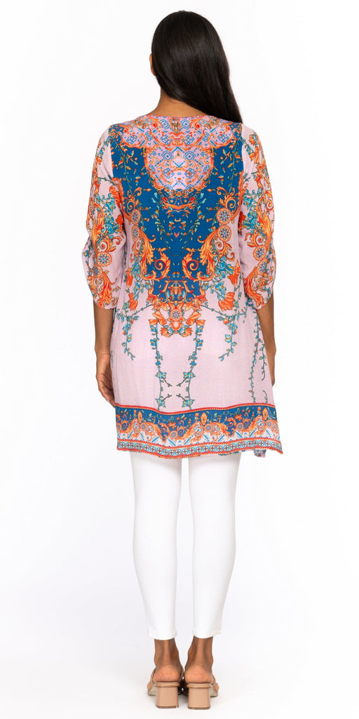 This silk tunic stuns with a mosaic-inspired print in jewel tones and neutrals. Its relaxed silhouette, side slits, and luxe drape make it an effortless piece for elevated everyday wear.