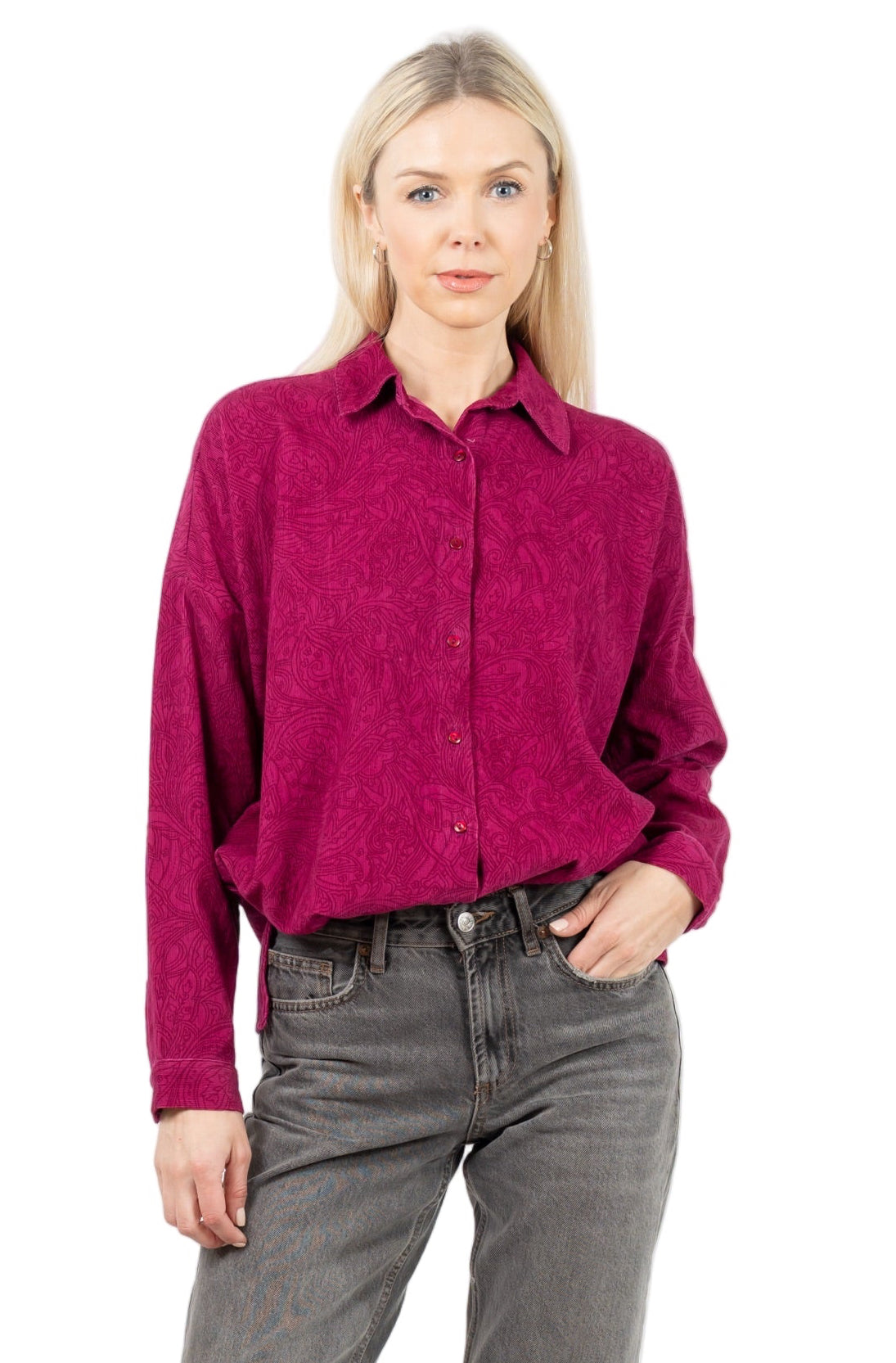 The Ysabel Berry Top combines timeless design with modern comfort. This collared blouse features a classic button-front closure and arrives in a sophisticated berry tone that complements diverse skin tones and seasonal palettes. Constructed from viscose, the fabric offers a fluid drape with natural breathability, while its lightweight composition ensures all-day wearability without bulk. Whether styled professionally or casually, this piece serves as a versatile foundation for any wardrobe.
