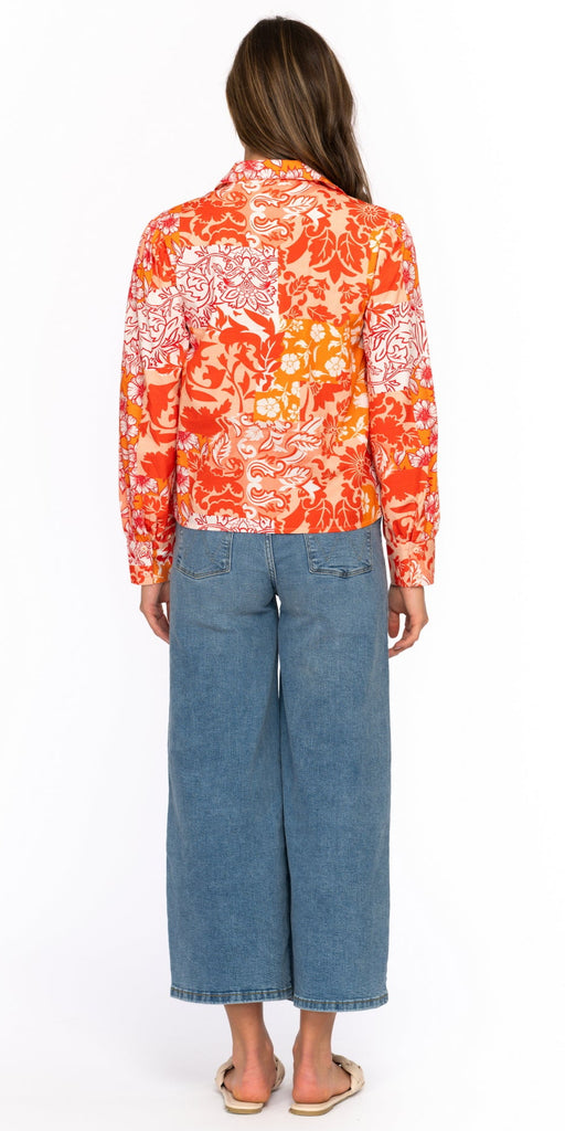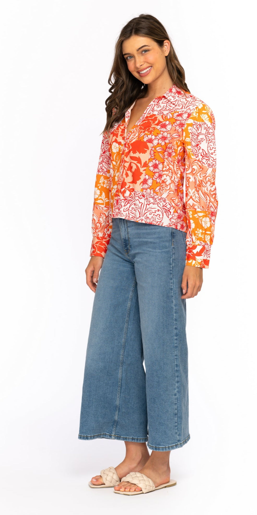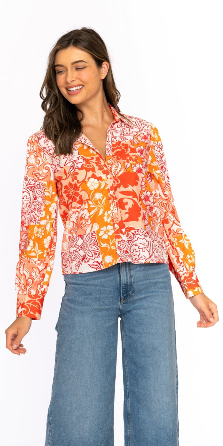 Brighten up your wardrobe with this bold floral button-down, featuring a striking mix of tangerine, coral, and sunshine hues. With its tailored collar, full-length sleeves, and flattering fit, this shirt effortlessly balances polished and playful—perfect for dressing up denim or adding a pop of color to your everyday look.