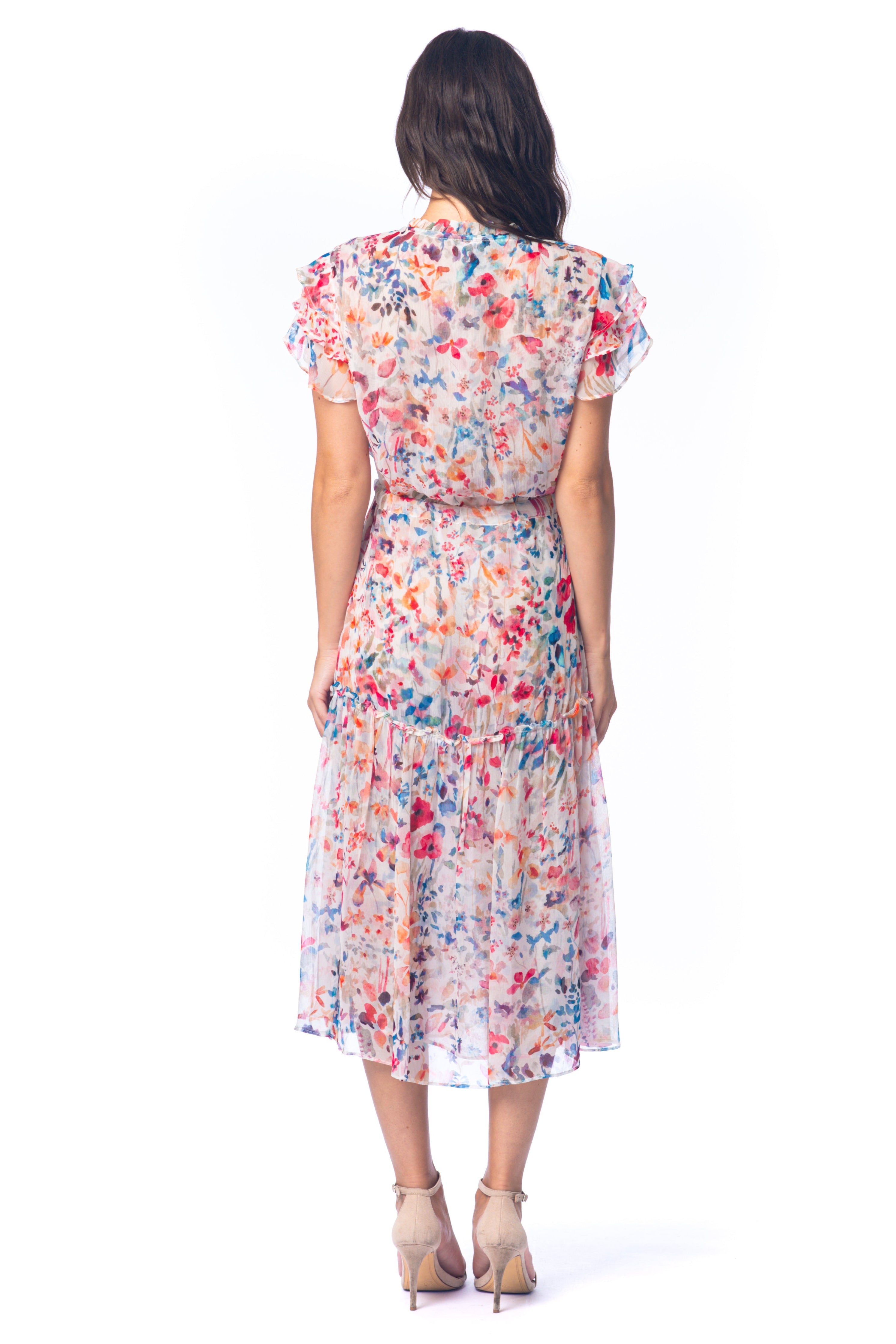 Romantic and effortlessly refined, this floral midi dress is awash in soft, painterly blooms in vibrant, garden-inspired hues. A split neckline and flutter sleeves add graceful movement, while a self-tie waist defines the silhouette with a customizable fit.