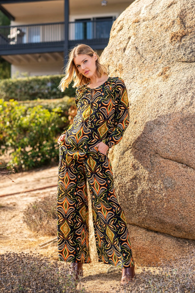 Featuring a vibrant mix of earthy greens, oranges, and golden tones, these flowy pants bring effortless movement and standout style to any outfit. Designed with a comfortable elastic waistband and a relaxed silhouette, they’re perfect for everything from casual weekends to chic evenings out.