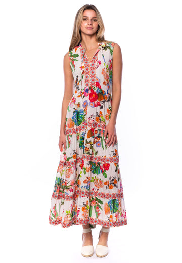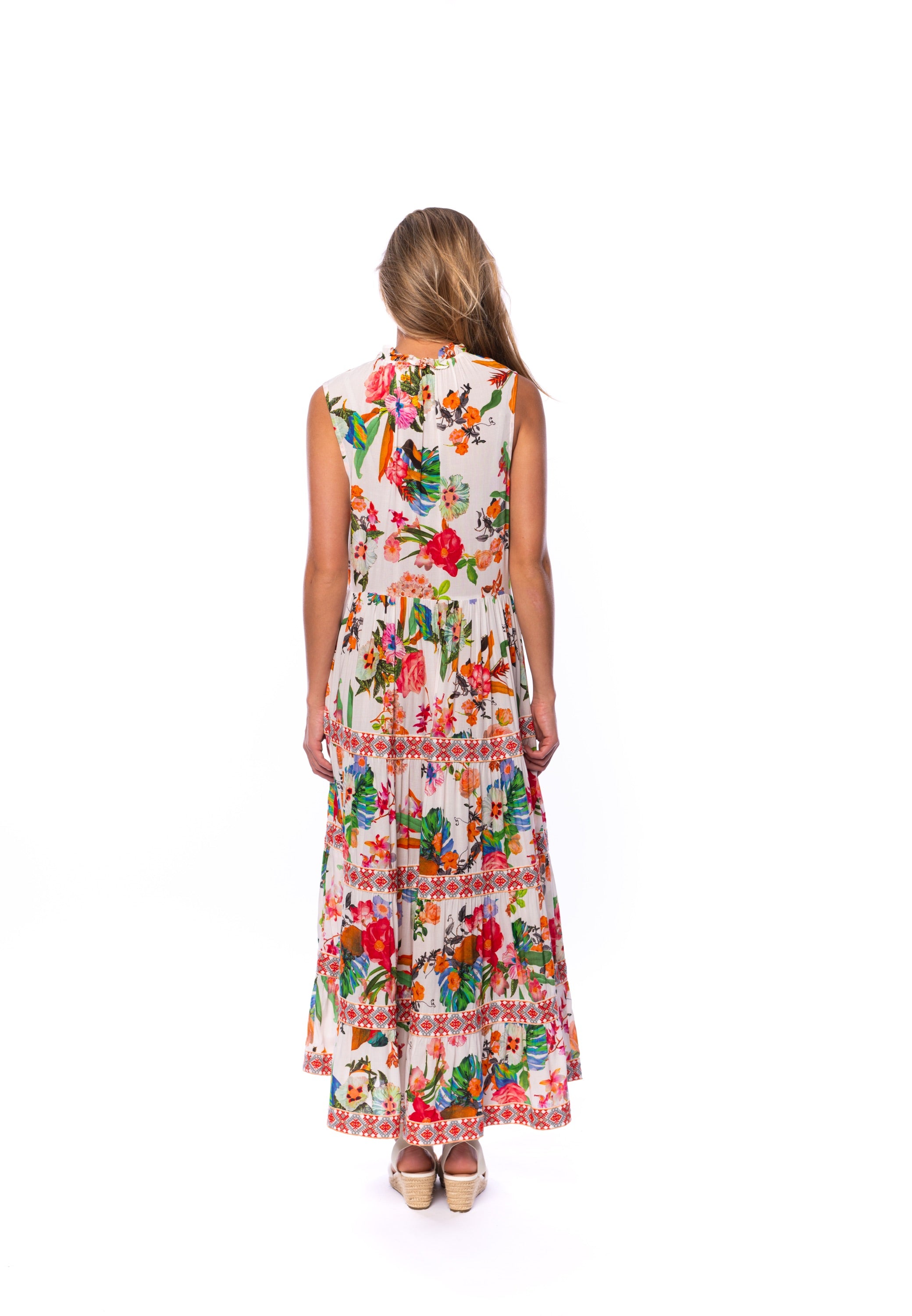 Turn heads in this vibrant tiered maxi dress, bursting with botanical color and artisan detail. Featuring a sleeveless silhouette, intricate border trim, and breezy cotton fabric, it’s your go-to piece for effortless summer style—whether you're brunching, strolling, or jet-setting.
