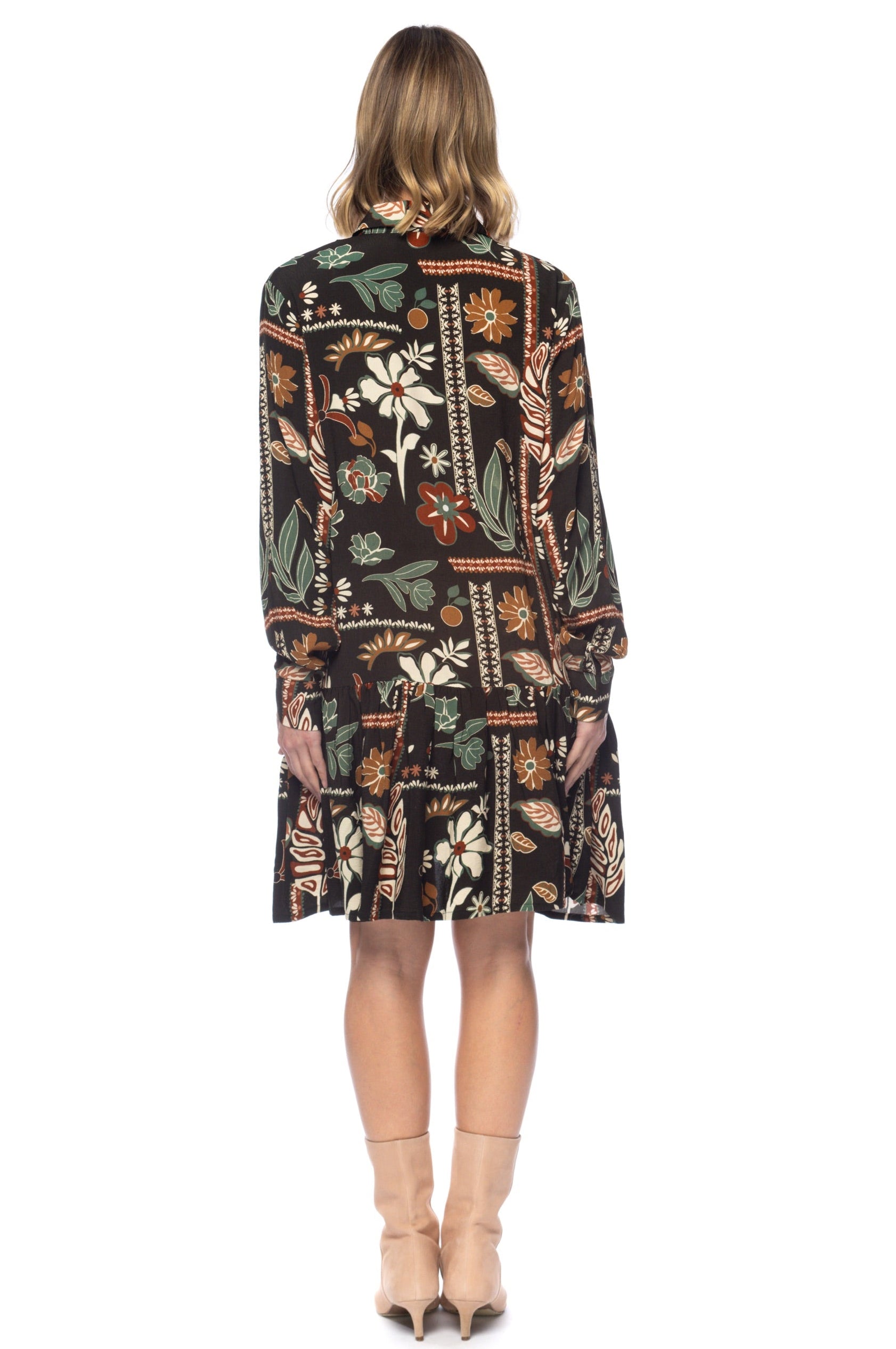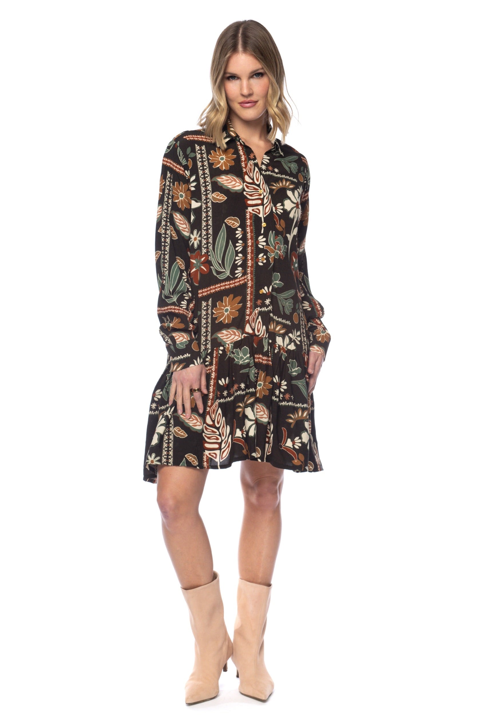 Effortlessly chic and brimming with bohemian charm, the Hatty Floral Shirt Dress brings a touch of artistry to your everyday wardrobe. Crafted from a soft, flowy fabric, this button-front dress features a rich patchwork-inspired print of earthy florals in warm coffee, rust, and sage tones. The relaxed silhouette with long sleeves and a gently flared hem creates graceful movement and an easy, flattering fit. Pair with neutral boots for a laid-back look or elevate it with statement accessories for a touch of refined flair.