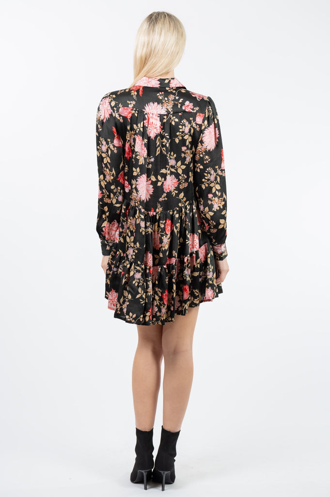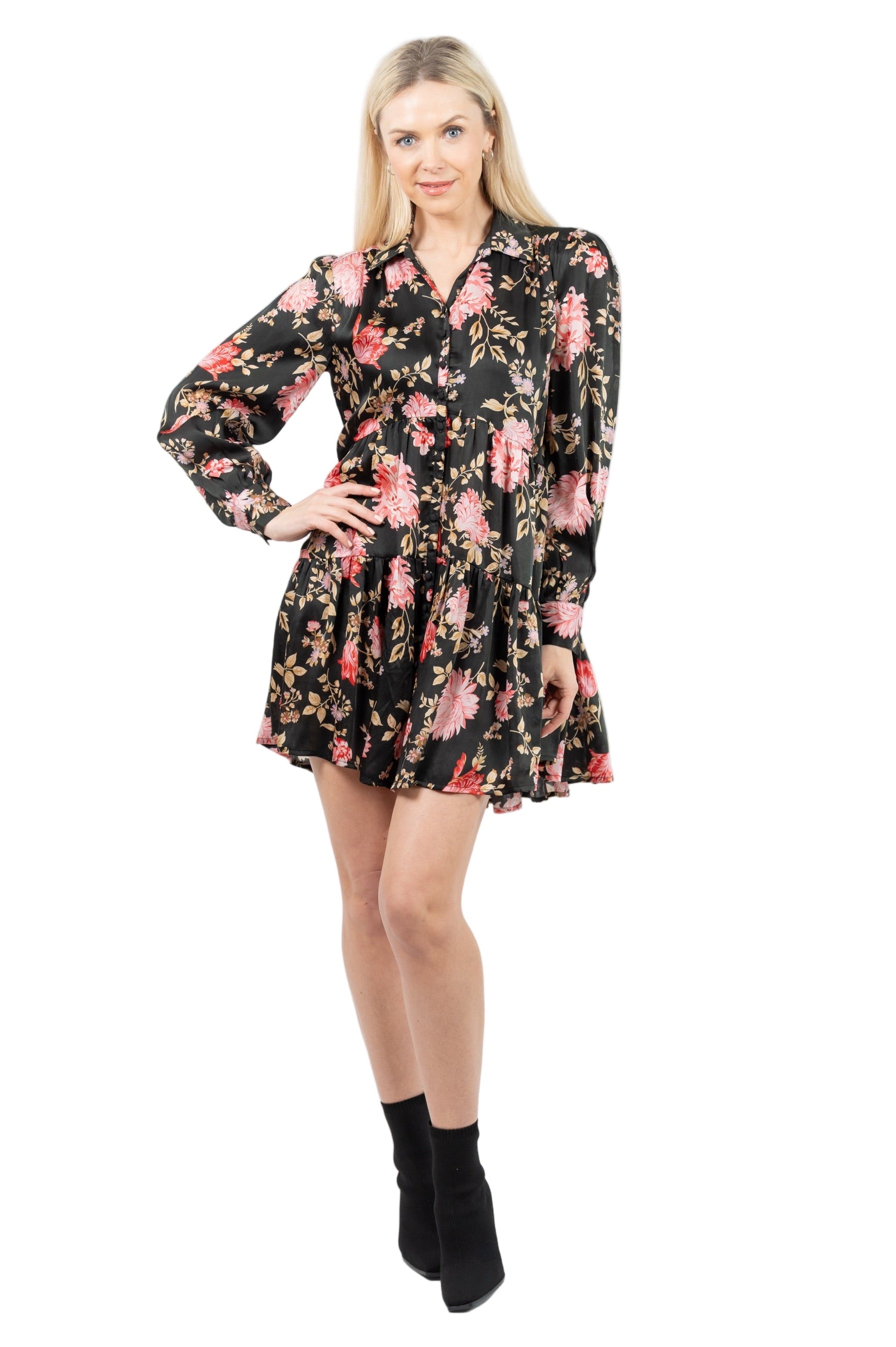 Radiate effortless holiday elegance in the Kanti Bloom Dress. Featuring a flattering tiered silhouette and a vibrant floral print in rich pinks, corals, and golds set against a deep black background, this dress captures a perfect balance of festive charm and sophistication. The button-front neckline and softly gathered long sleeves add a refined, feminine touch, while the playful hemline brings movement and flair.
