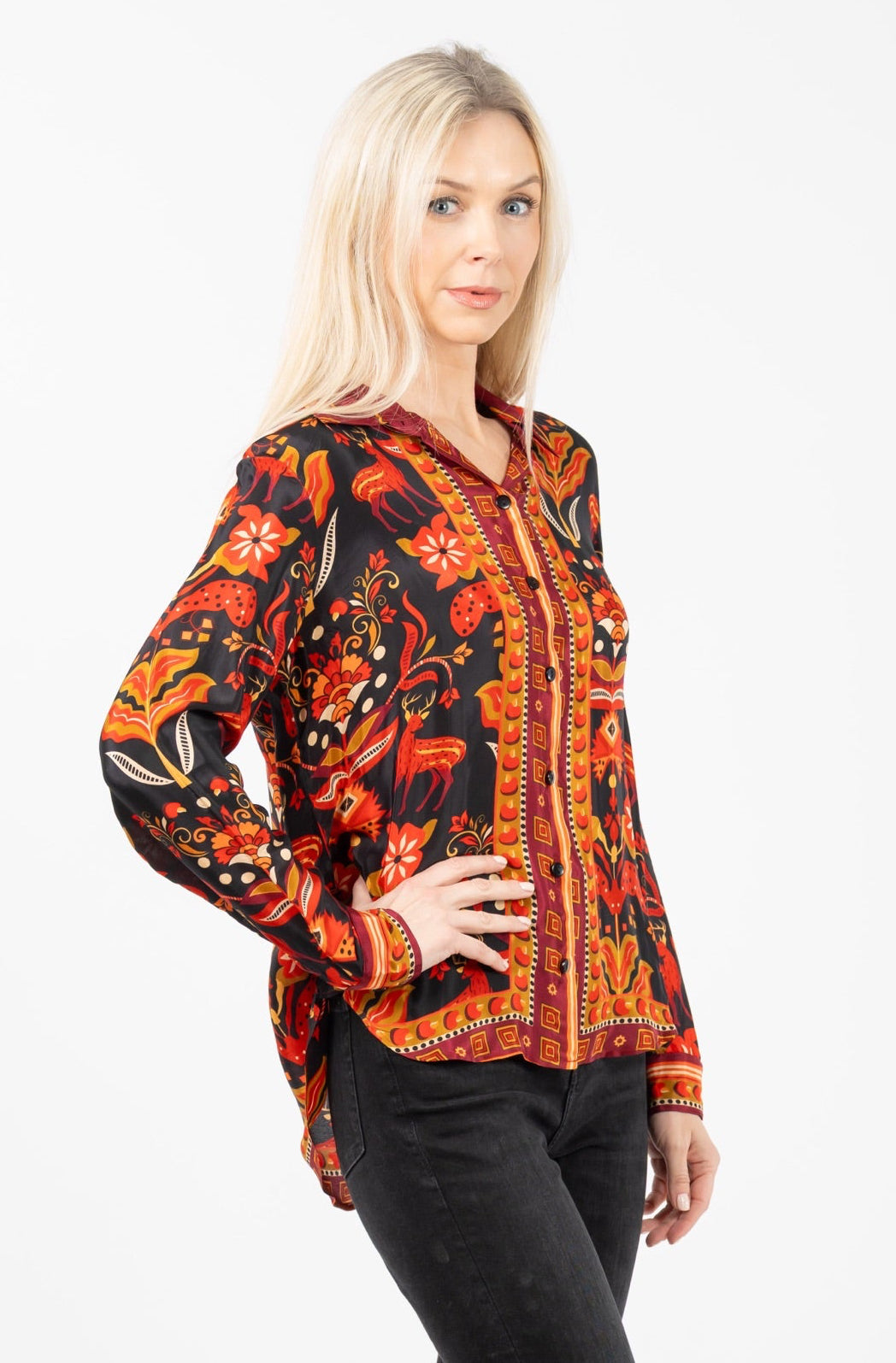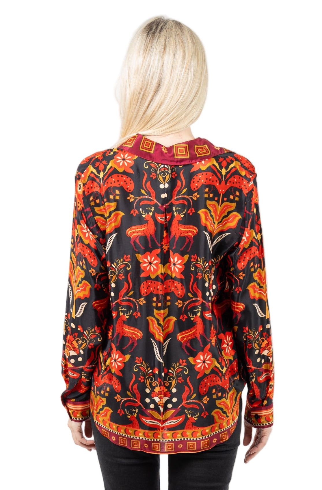 Bold, vibrant, and full of festive spirit, the Keani Sangria Blouse is the perfect piece to elevate your holiday wardrobe. Featuring a striking mix of warm reds, golds, and deep wine tones against a rich black backdrop, this button-front blouse captures the essence of effortless sophistication. Intricate patterns and a contrasting border design bring an artisanal flair, while the relaxed silhouette and soft drape make it as comfortable as it is eye-catching.