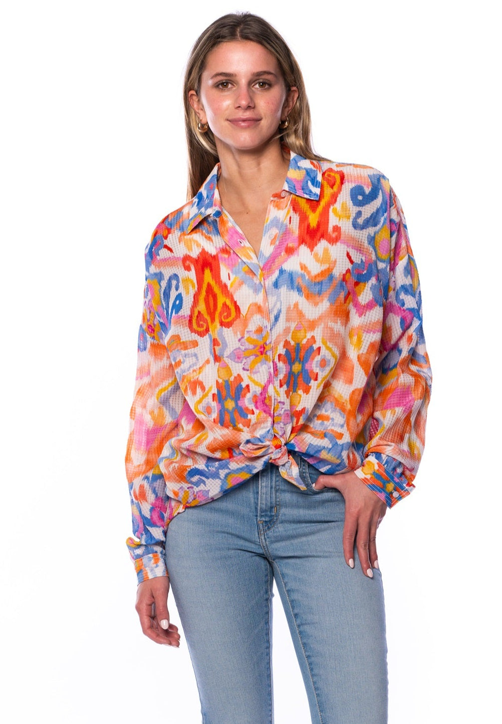 Introducing the Kennedy Ikat Top - expertly crafted with a beautiful Ikat pattern, button front placket, and classic collar. With long sleeves to keep you comfortable and stylish, this top adds a touch of sophisticated elegance to any outfit. Perfect for any occasion.