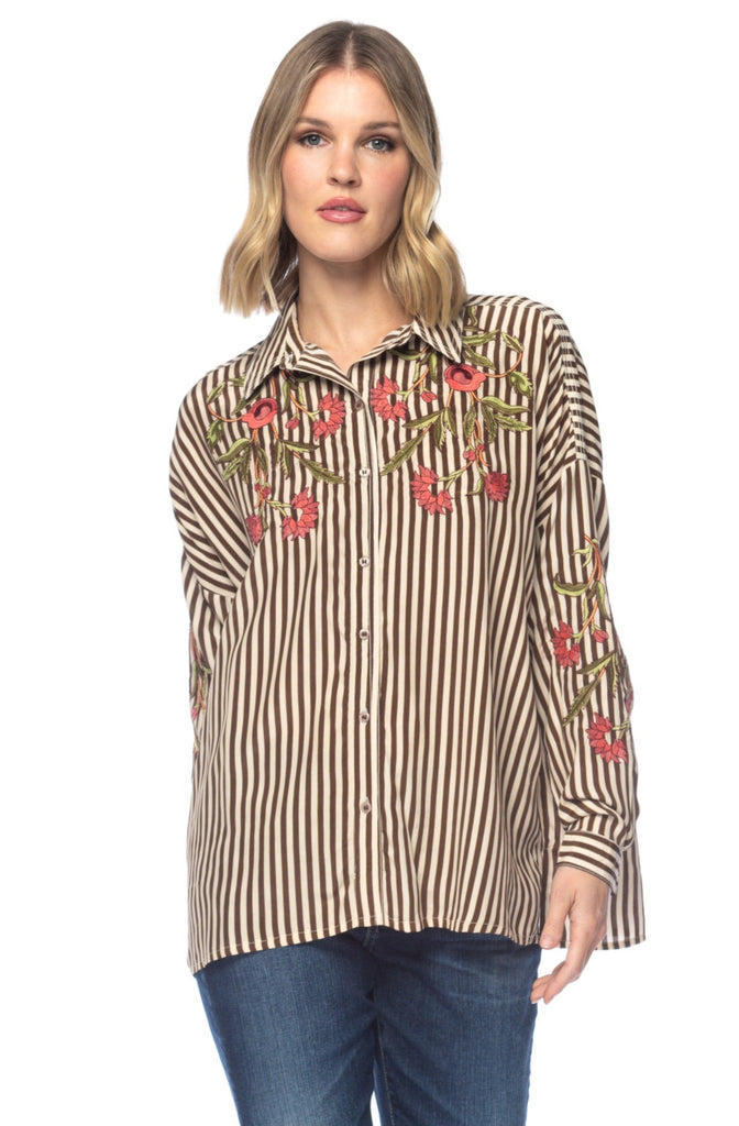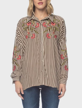 This shirt reimagines classic tailoring with a bohemian twist. Crafted from lightweight fabric in neutral brown-and-cream stripes, it’s elevated by vibrant floral embroidery across the chest and sleeves. Designed with a relaxed silhouette, point collar, and buttoned cuffs, it balances structure with ease, making it an ideal piece to dress up denim or layer under a blazer.
