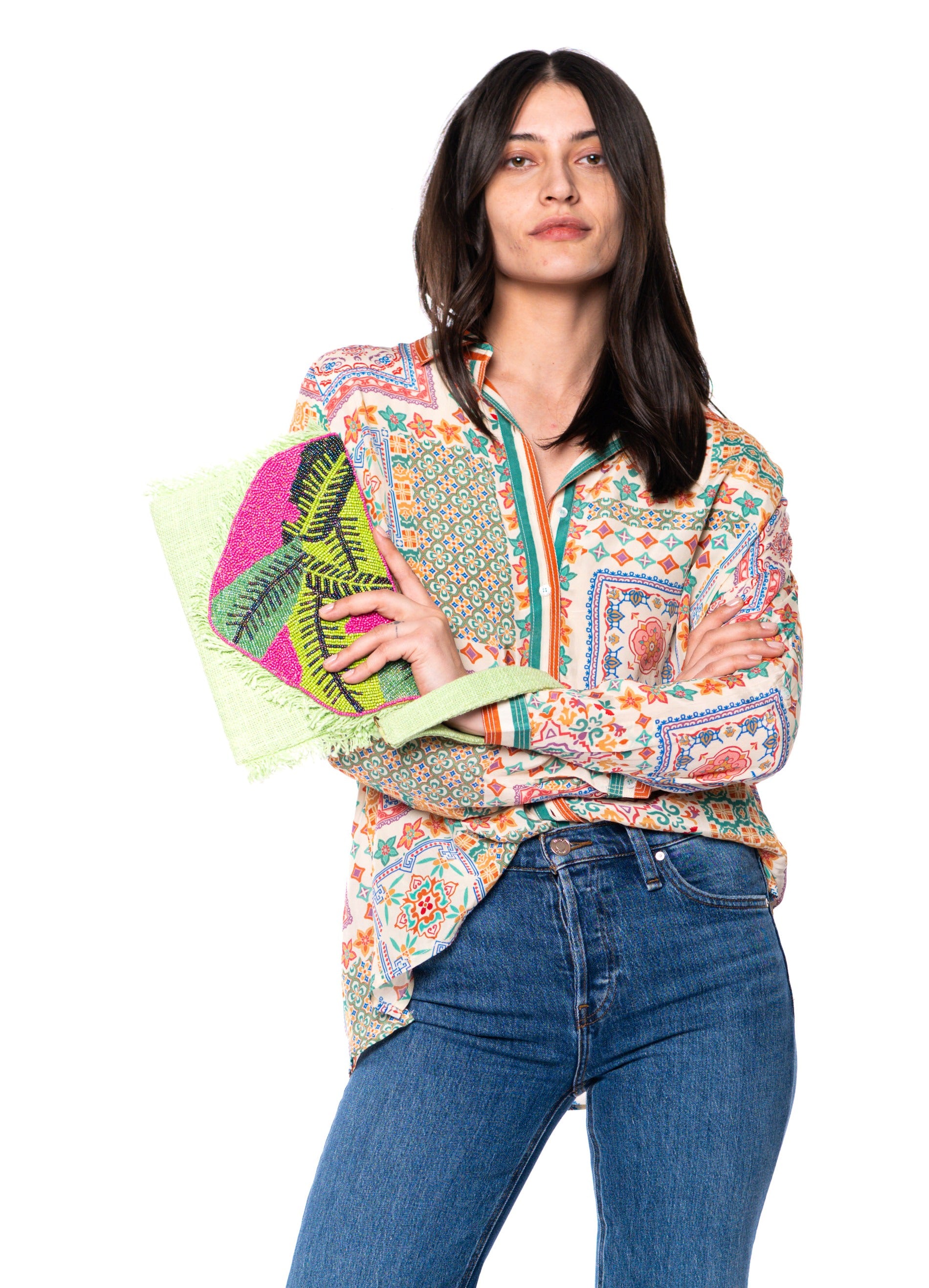 Elevate your style with this handcrafted tote, adorned with a beaded leaf design on a mint green canvas. The tote is secured with a snap-button flap closure and features charming fringe details, along with a matching wristlet strap for convenience and a touch of whimsy. Expertly crafted with natural fibers for durability, this tote also boasts stunning artisanal beadwork and weaving, giving it a unique and distinctive look. Secure your belongings with the snap-button closure hidden under the flap.