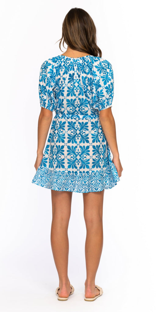 Bring vacation vibes wherever you go in this breezy mini dress, featuring a bold blue-and-white print, soft ruffle hem, and drawstring waist for a flattering fit. With puff sleeves and a relaxed silhouette, it’s the perfect piece to take you from poolside to patio in effortless style.