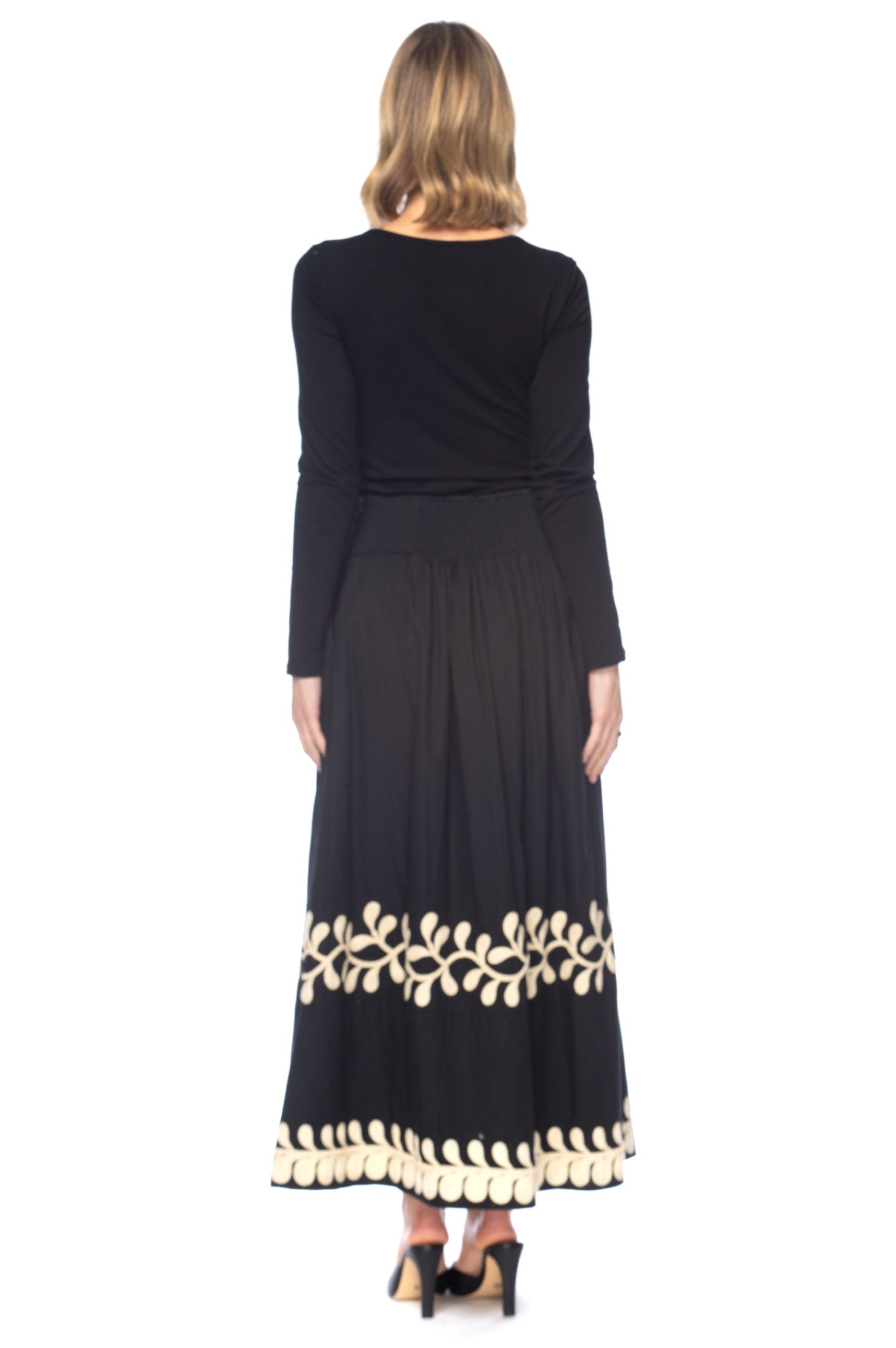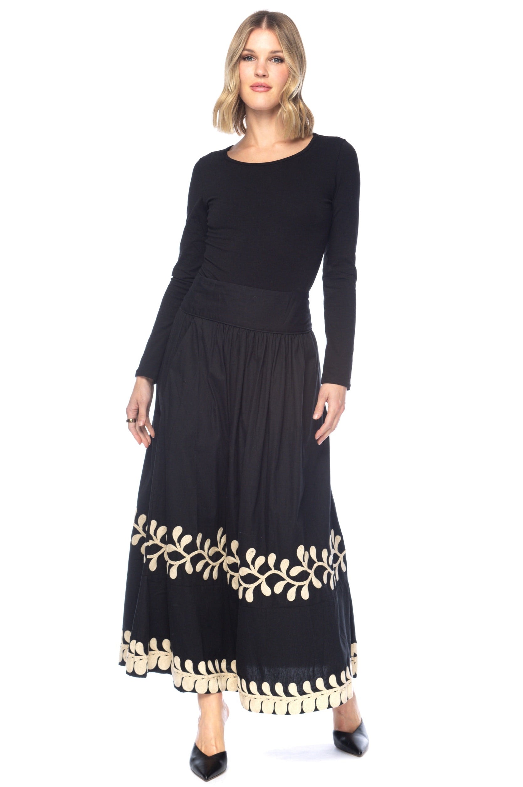 Elegant and effortlessly chic, the Madonna Onyx Skirt brings a timeless touch to your wardrobe. Crafted in a flowing black fabric, this full-length skirt features intricate ivory embroidery along the hemline in graceful leaf motifs. With its flattering waistband and easy, feminine silhouette, it moves beautifully with every step — perfect for day-to-night dressing.