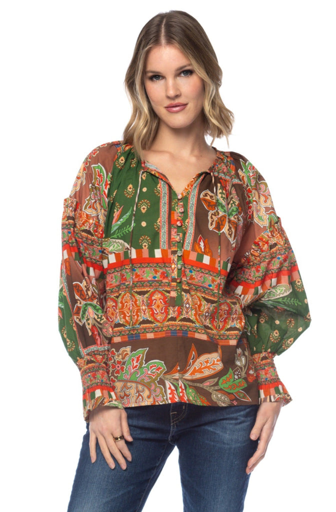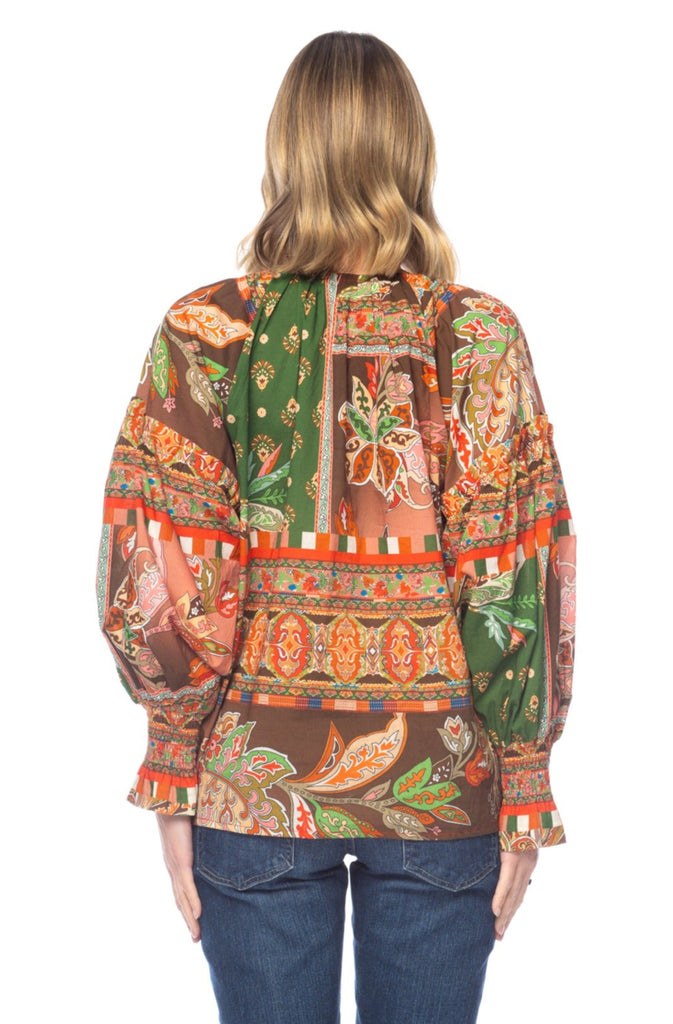 Designed in a relaxed silhouette, this top features a vibrant patchwork-inspired print in earthy greens, rusts, and warm autumn tones. Billowed sleeves with cuff detail and a tassel-tie neckline add a touch of femininity, making it the perfect statement blouse for both casual days and evenings out.