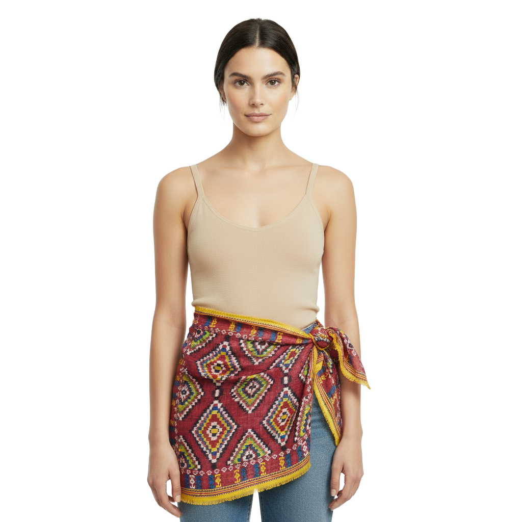 This scarf is a vibrant display of cultural artistry, featuring a bold geometric diamond pattern in rich burgundy, yellow, green, blue, and white hues. The intricate design is framed by a detailed border in complementary tones, enhancing its traditional yet contemporary aesthetic. Made from soft, lightweight fabric, it offers comfort and versatility for various occasions. The fringed edges add a playful and textured finish, making it an eye-catching accessory. Whether styled as a wrap, shawl, or statement piece, this scarf brings warmth and character to your wardrobe, celebrating a fusion of heritage-inspired patterns and modern fashion.