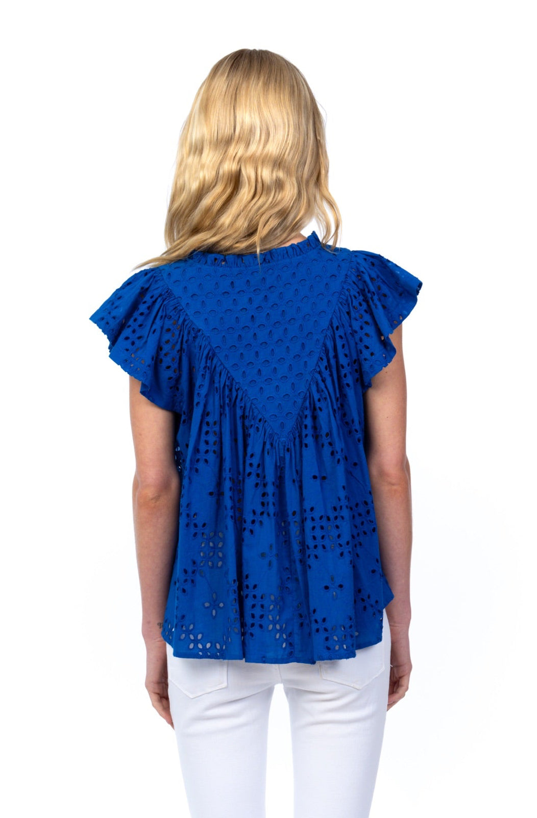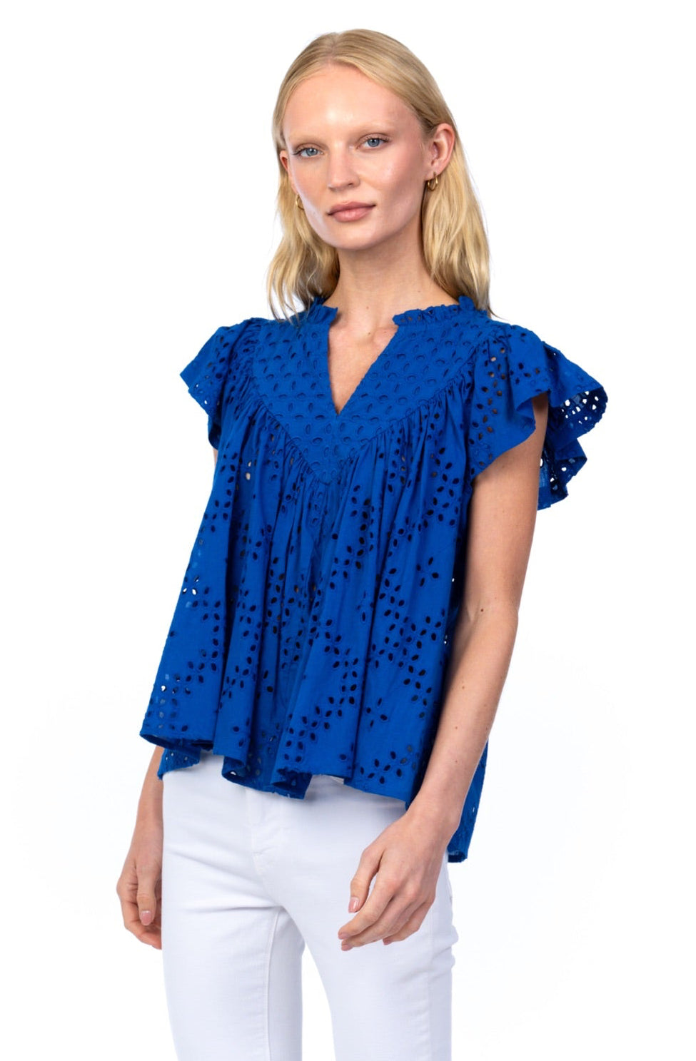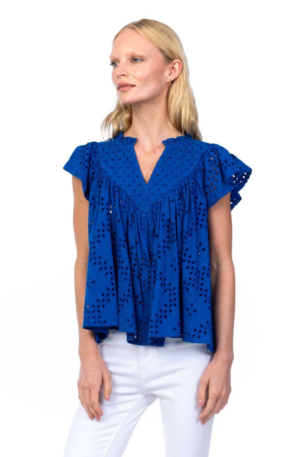 Bursting with texture and charm, this breezy blouse is crafted in a vivid cobalt hue with delicate eyelet detailing throughout. The softly gathered silhouette drapes effortlessly, while a ruffled V-neckline adds a touch of romantic flair. Fluttery cap sleeves lend light movement and an airy feel, making it perfect for sun-soaked days and balmy evenings alike.