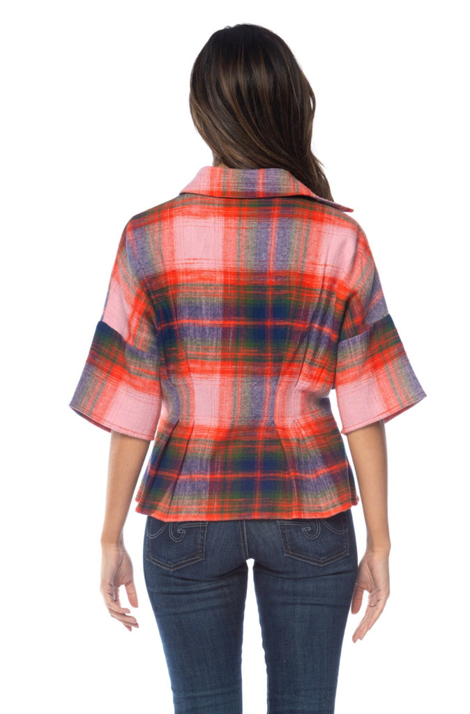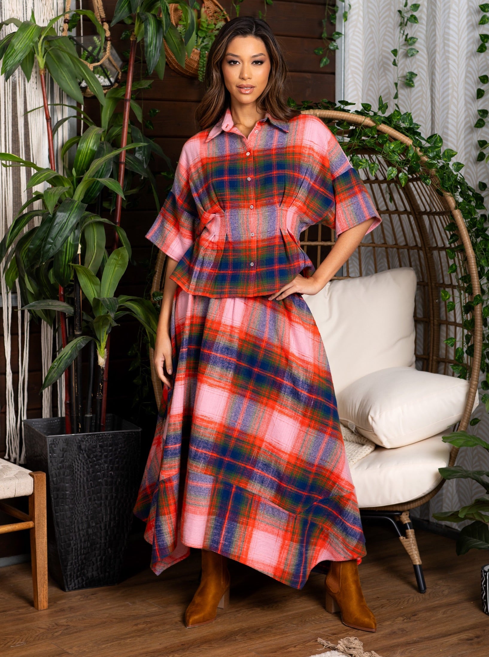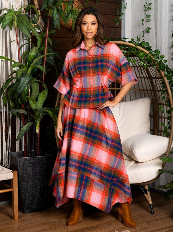 The Perla Passion Top brings a modern twist to classic plaid. Cut from soft, midweight cotton blend, it features a vibrant, multicolored check pattern that feels equal parts bold and playful. The relaxed silhouette is framed by wide elbow-length sleeves and a gently flared hem that adds feminine shape and ease.