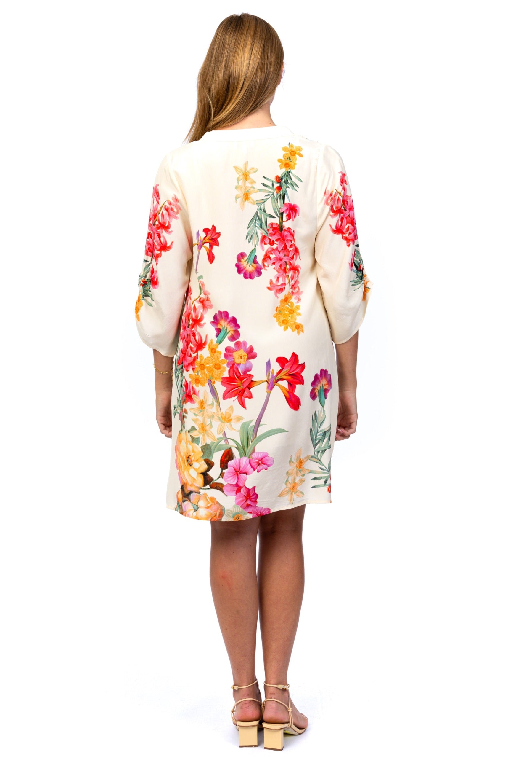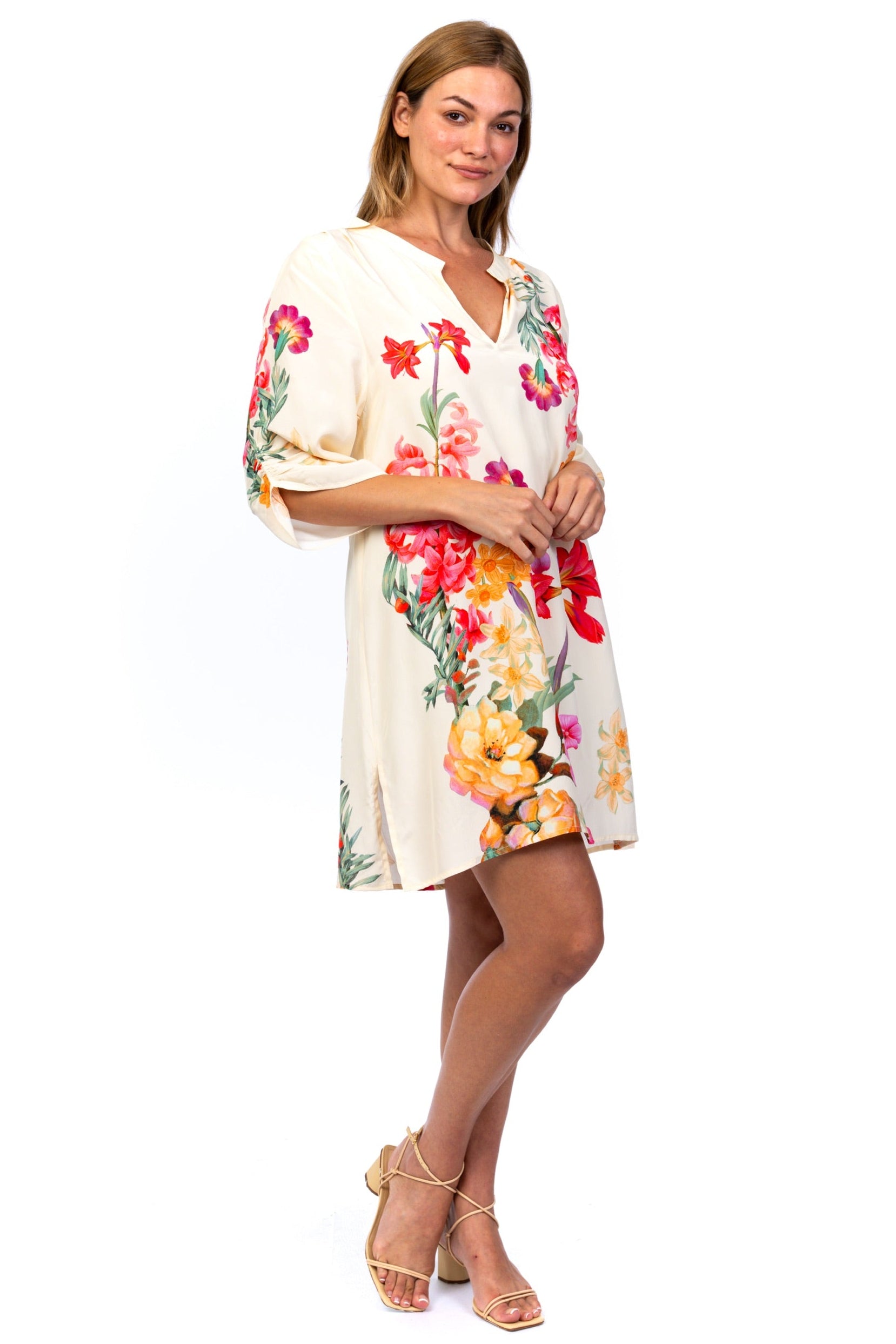 Elegant and effortlessly feminine, this floral shift dress is a standout piece for warm-weather styling. Crafted in a soft ivory tone, it features a vibrant botanical print in shades of red, pink, orange, and yellow for a fresh, eye-catching look.